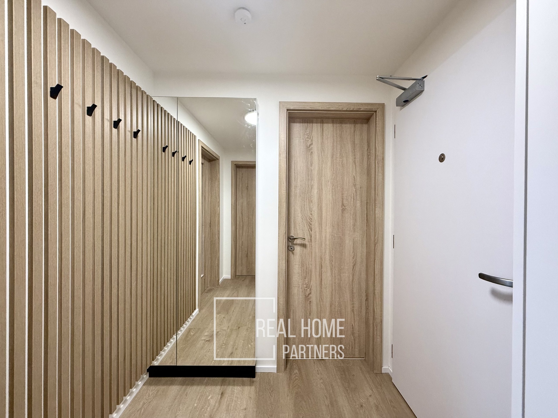 V bytě jsou venkovní žaluzie na dálkové ovládání, vysoké stropy, kvalitní podlahy a decentní neutrální barevnost, která prostor opticky zvětšuje.