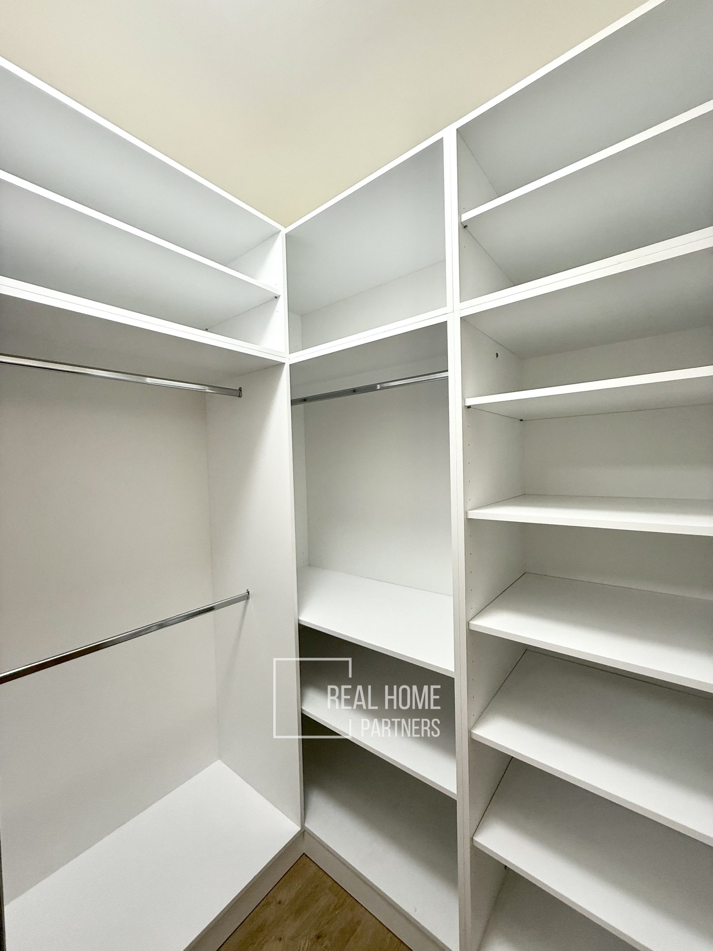 The apartment features remote-controlled exterior blinds, high ceilings, quality flooring, and a soft neutral color palette, which visually enhances the spacious feel of the interior.