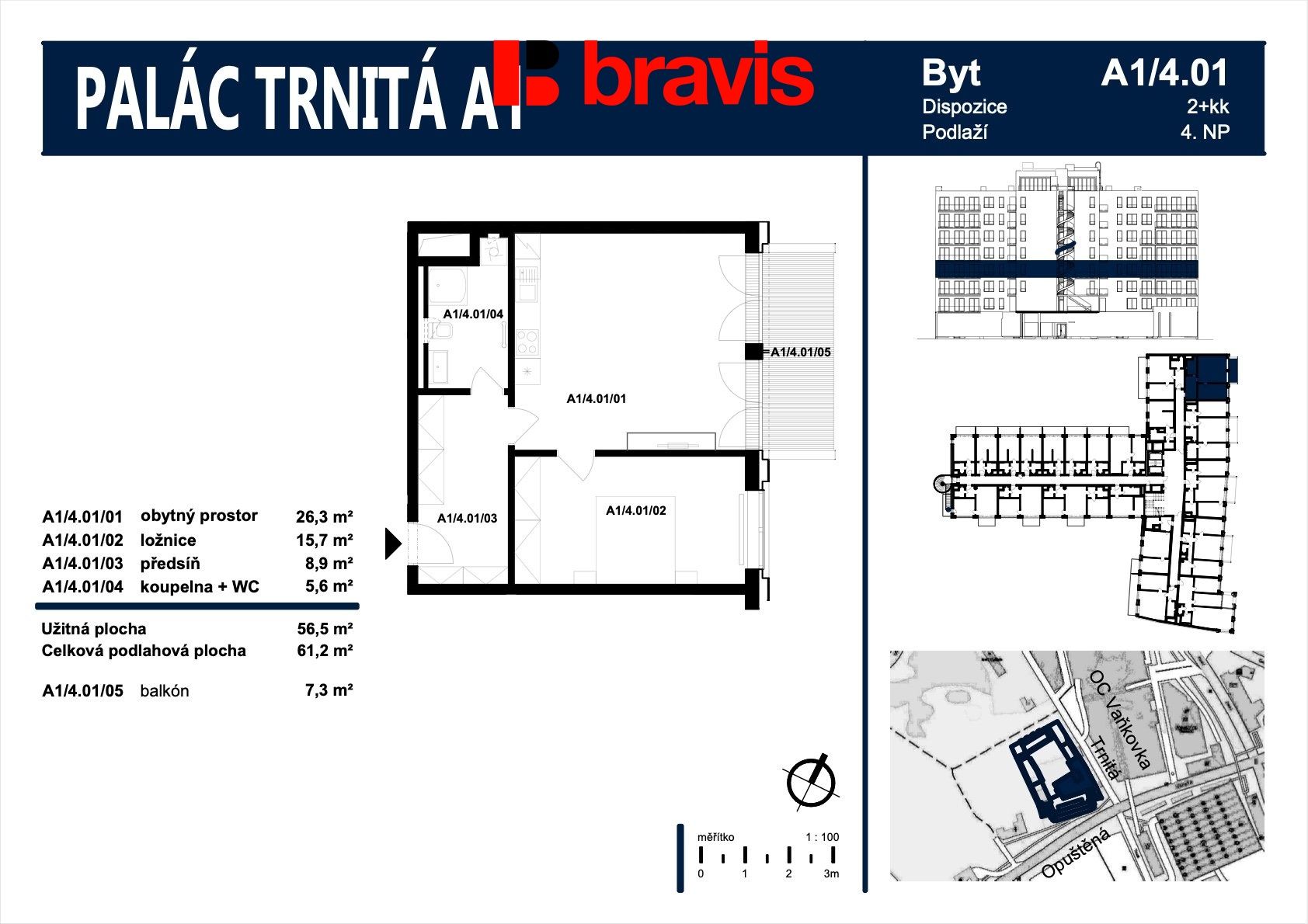 Byt o dispozici 2+kk a užitné ploše 57 m2, nacházející se ve 4. nadzemním podlaží, je zařízen moderně a prakticky.