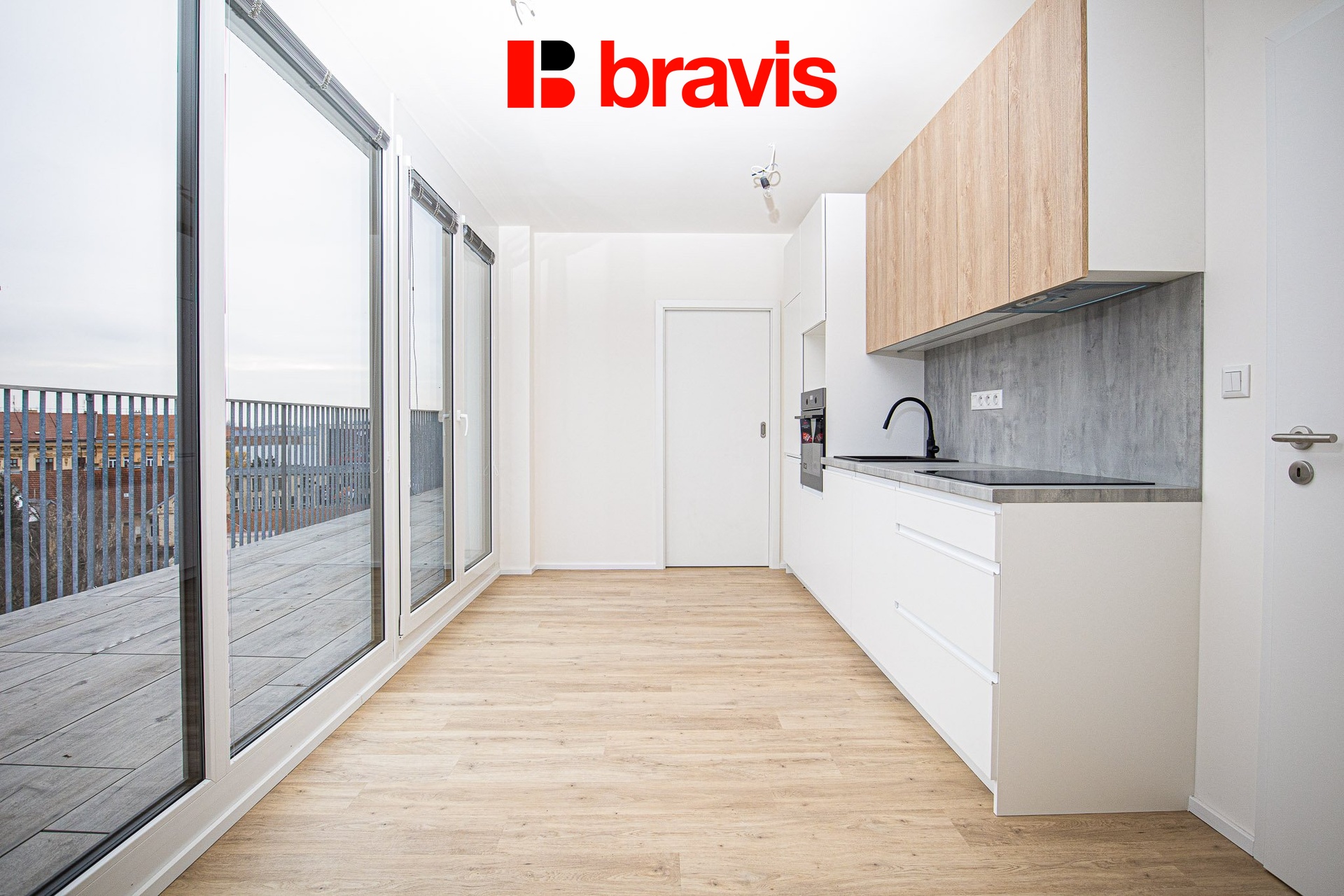 Z obývací části je přímý vstup na terasu, která nabízí orientaci na areál Nové Zbrojovky – ideální místo pro ranní kávu nebo večerní posezení.