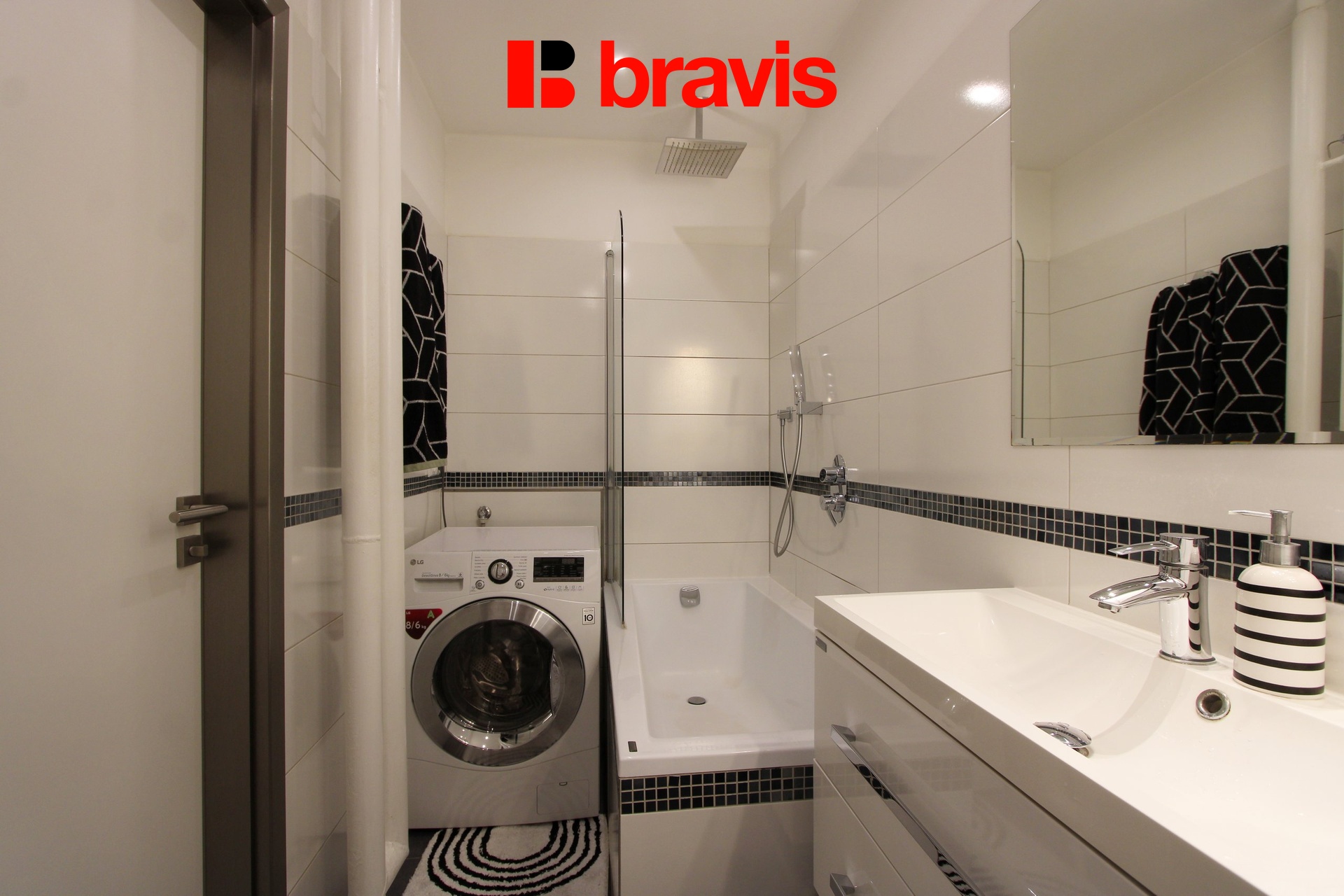 Koupelna je vybavena umyvadlem se skříňkou, vanou se sprchou, zrcadlem, pračkou se sušičkou, toaletou a je zde podlahové vytápění.
