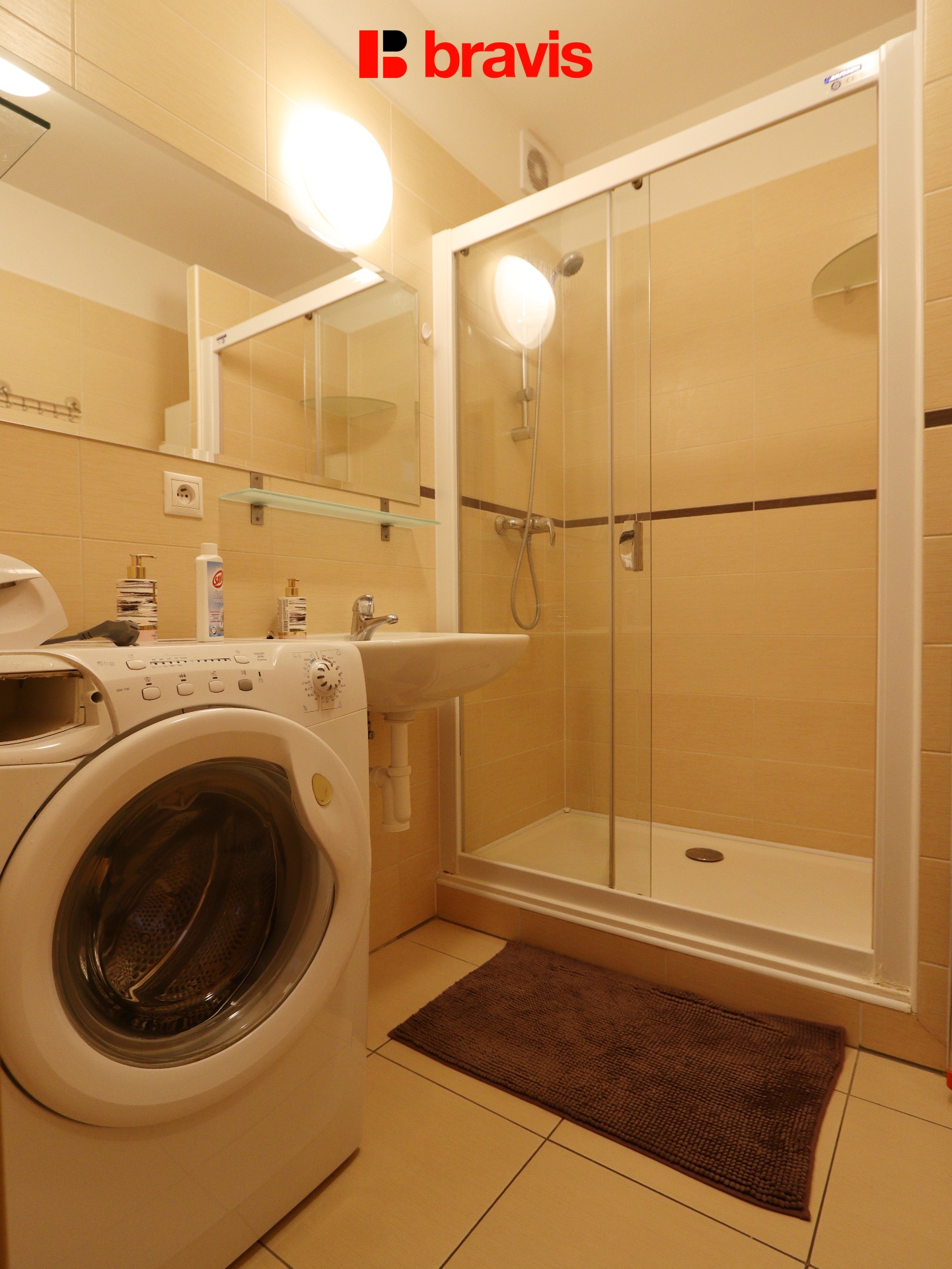Koupelna je vybavena sprchovým koutem, umyvadlem a pračkou.