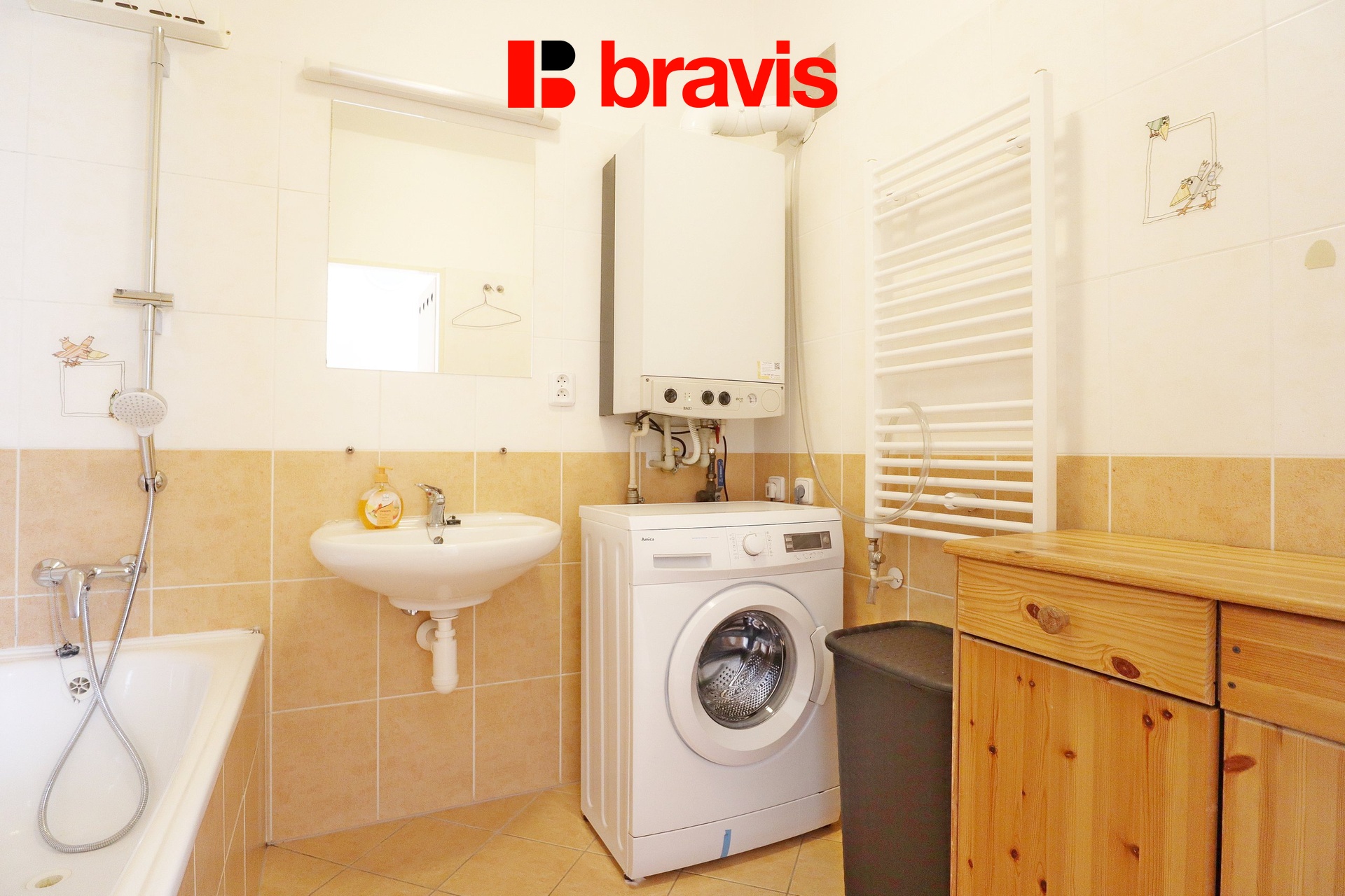 V koupelně je vana, umyvadlo, otopný žebřík a pračka. Toaleta je v bytě samostatně.