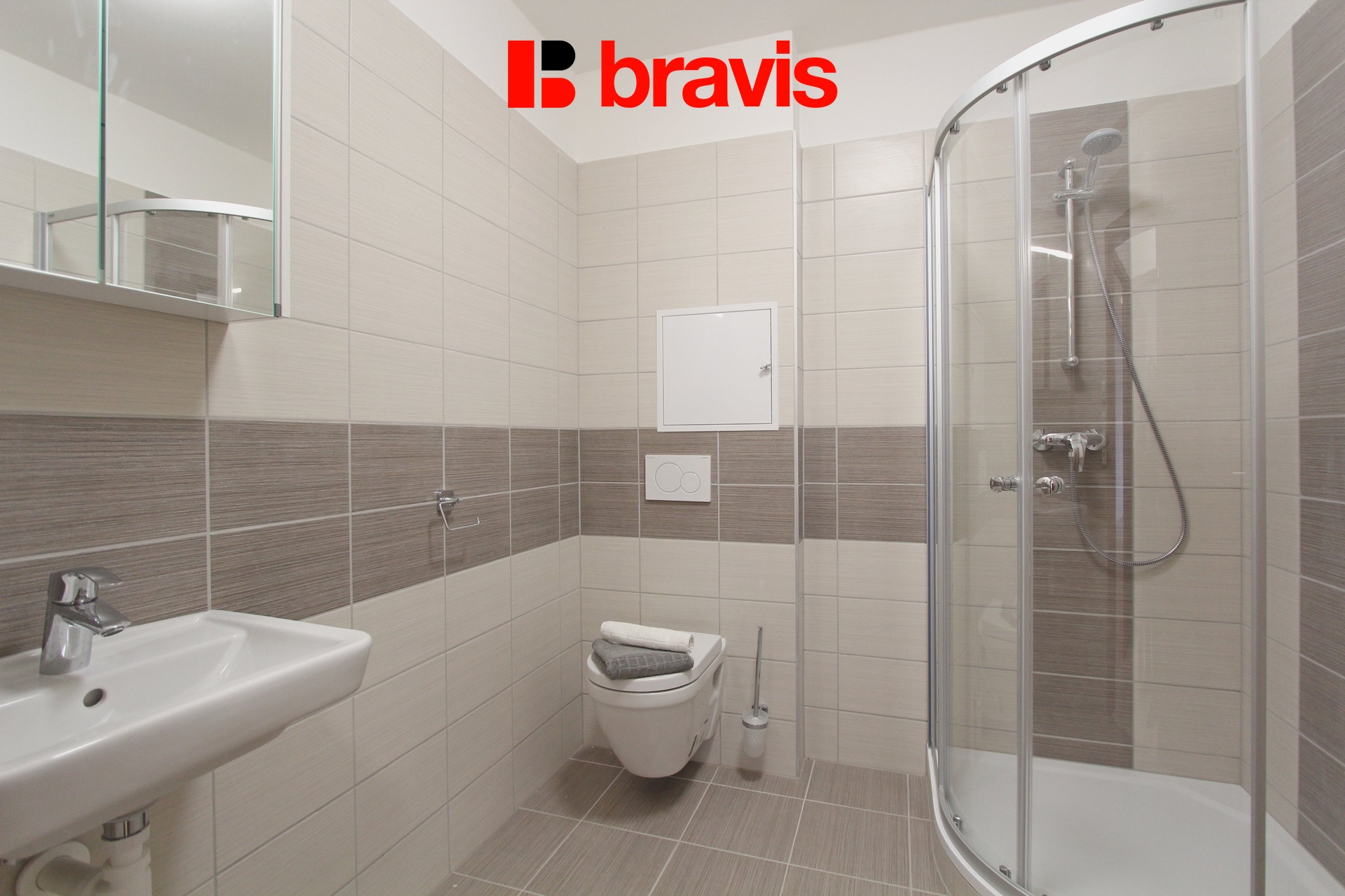 V koupelně je sprchový kout, umyvadlo se zrcadlovou skříňkou, přípojka na pračku a toaleta