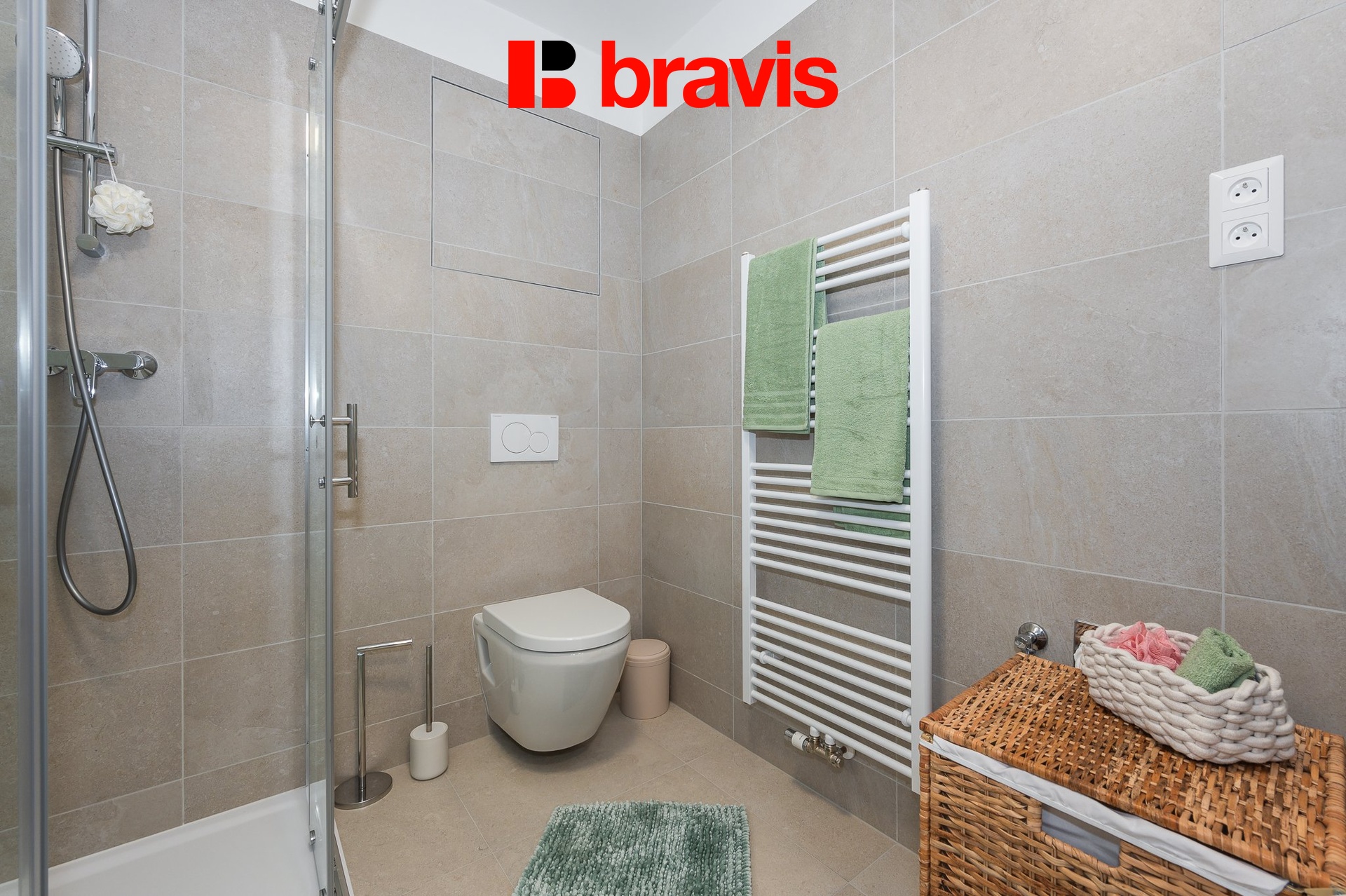 V koupelně se nachází toaleta, sprchový kout, umyvadlo, otopný žebřík a kombinovaná pračka se sušičkou.
