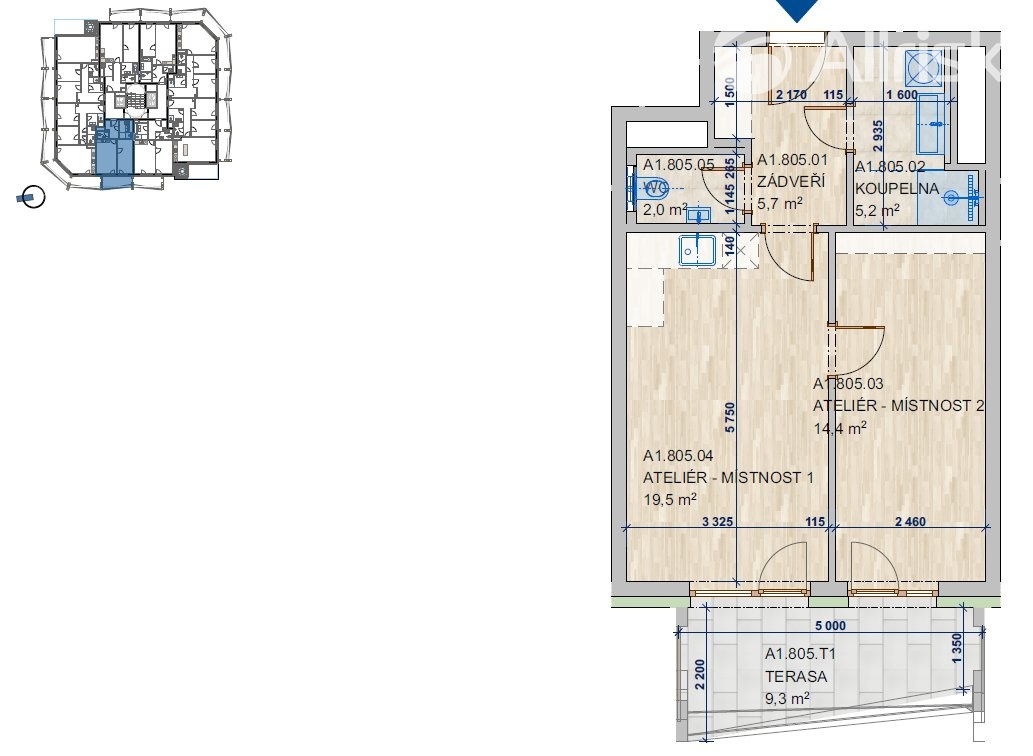 Dispozice ateliéru zahrnuje prostornou hlavní místnost s kuchyňským koutem, samostatný pokoj, chodbu, koupelnu se sprchovým koutem a samostatné WC. Terasa orientovaná na západ nabízí příjemné místo pro relaxaci i pracovní setkání s výhledem na panorama města.