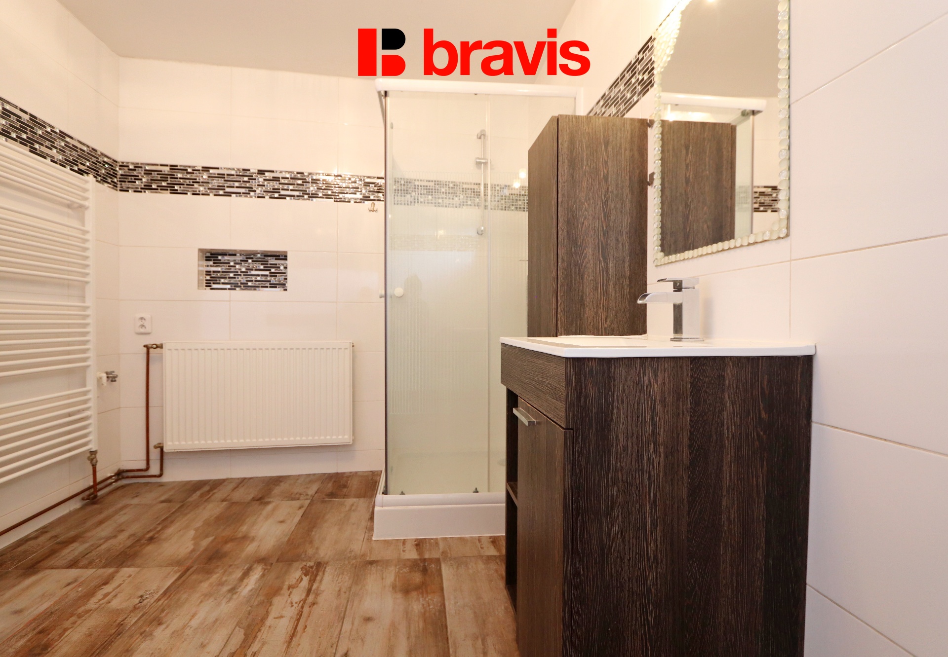 Koupelna je zařízena vanou i sprchovým koutem, umyvadlem, toaletou, otopným žebříkem a přípojkou na pračku.