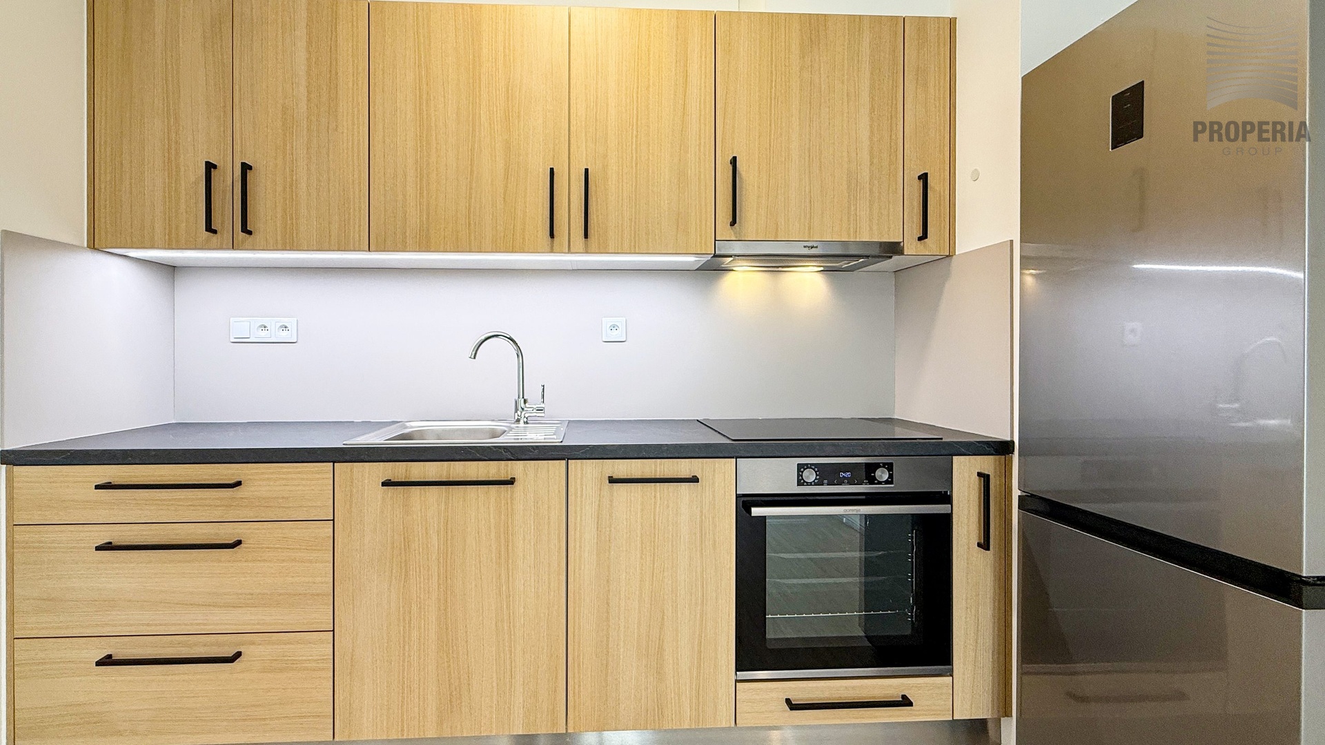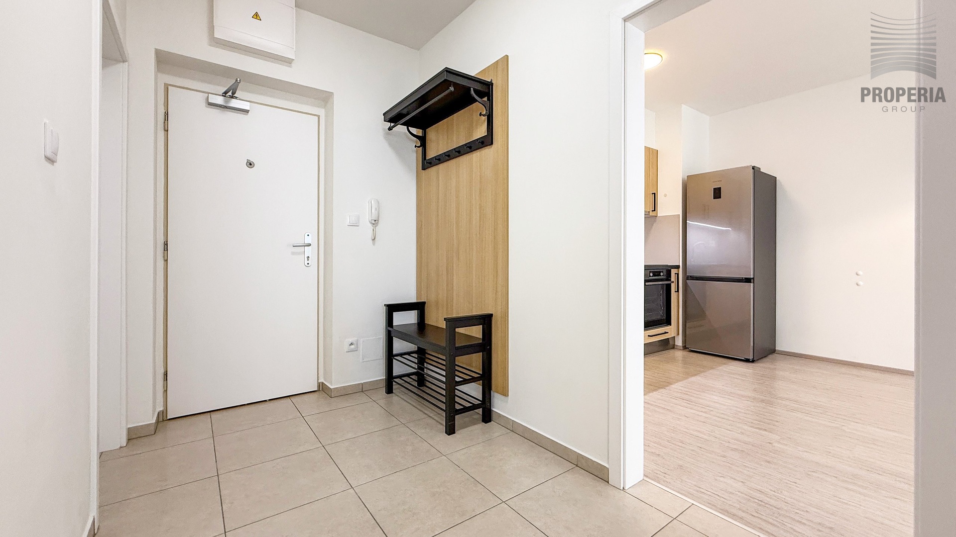 Obývací pokoj je propojený s kuchyňským koutem vybaveným kuchyňskou linkou se spotřebiči (samostatně stojící lednice, vestavná trouba, varná deska, myčka a odsavač). Ložnice je nevybavená, k dispozici je větší šatní skříň IKEA. Koupelna je vybavena vanou, koupelnovým nábytkem a pračkou se sušičkou značky Haier. Toaleta je samostatná. V předsíni se nachází botník a věšák. K bytu náleží balkon a sklep.