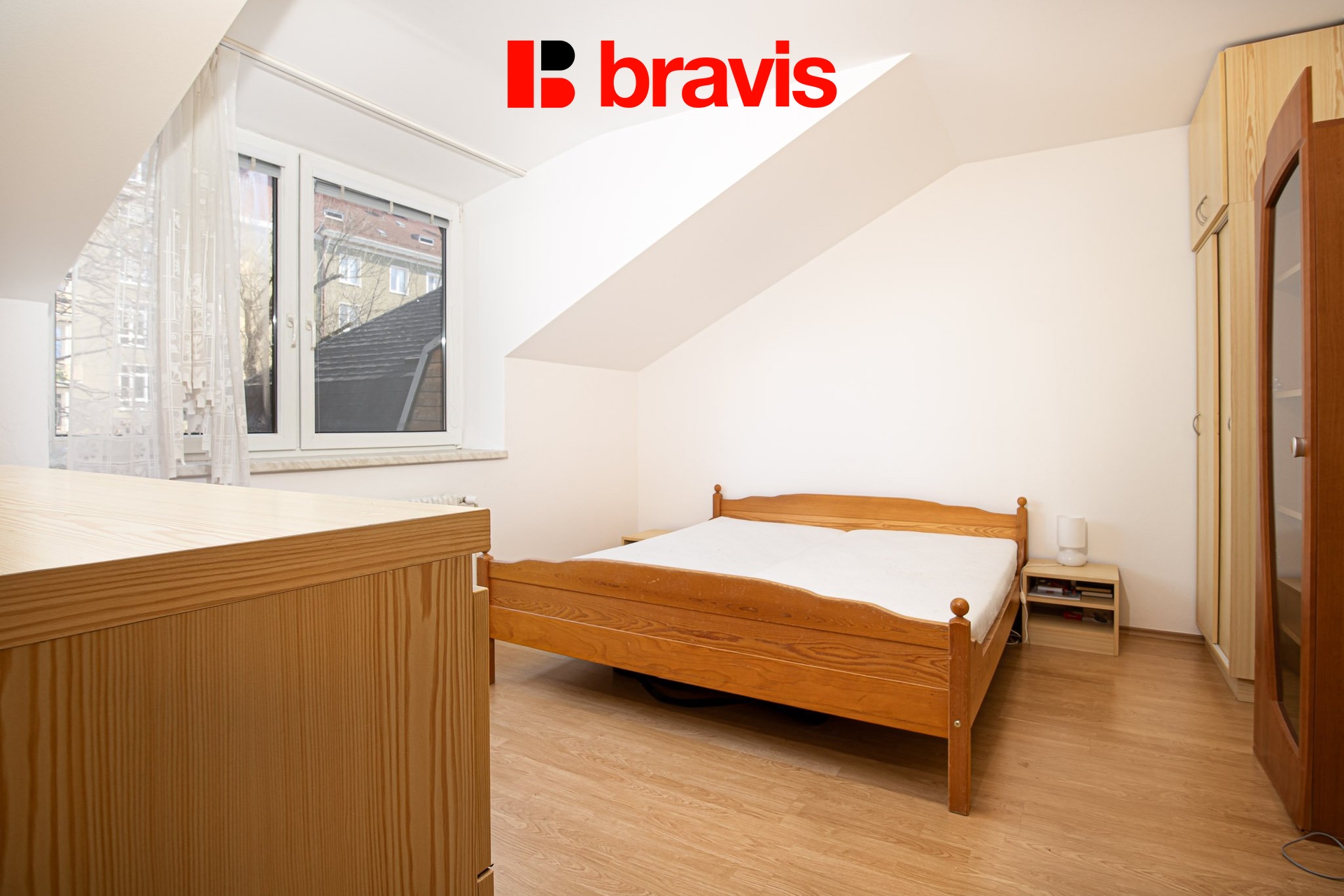 Ložnice je vybavena manželskou postelí, šatními skříněmi, komodou a pracovním stolem.