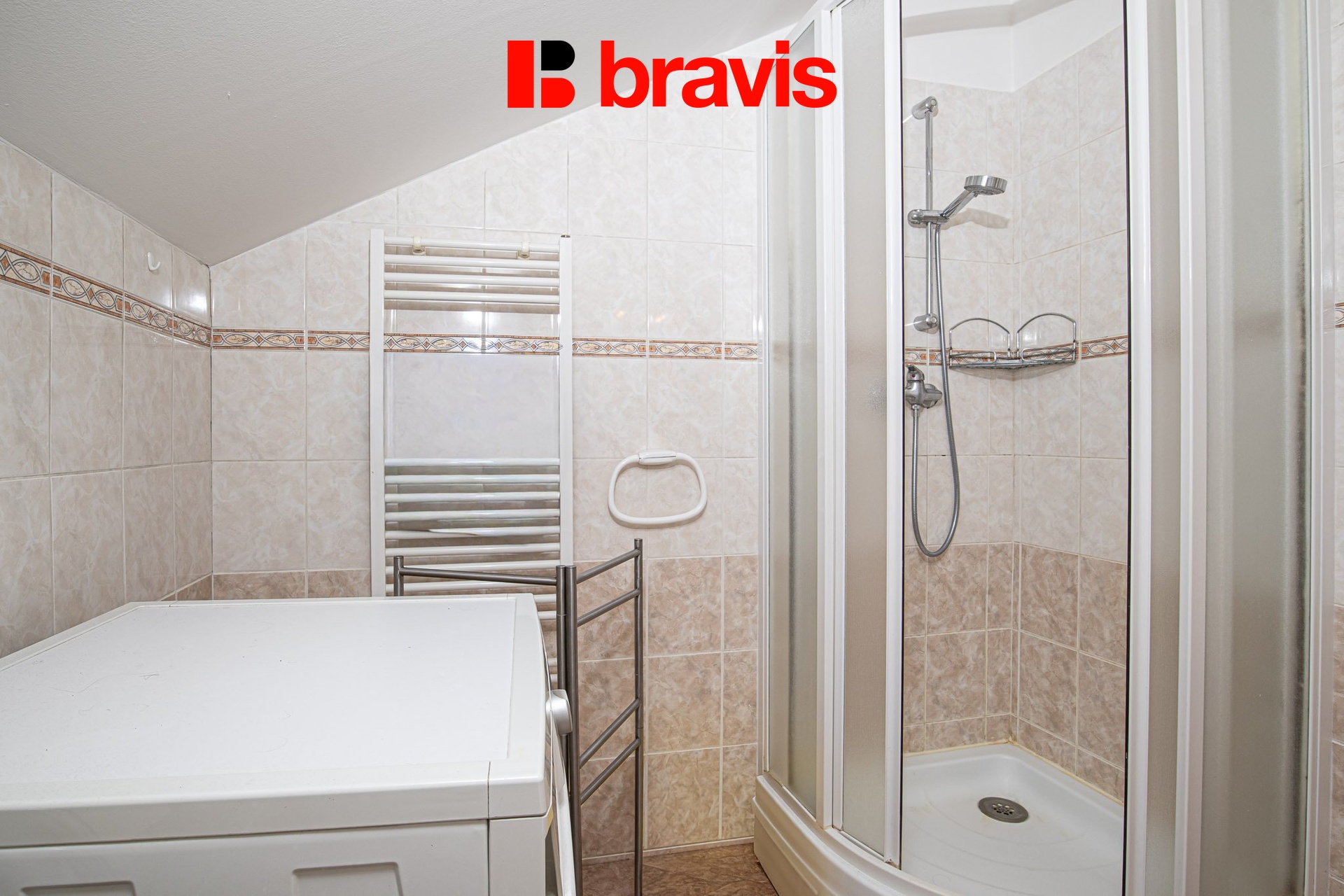 V koupelně je sprchový kout, umyvadlo, otopný žebřík a pračka.