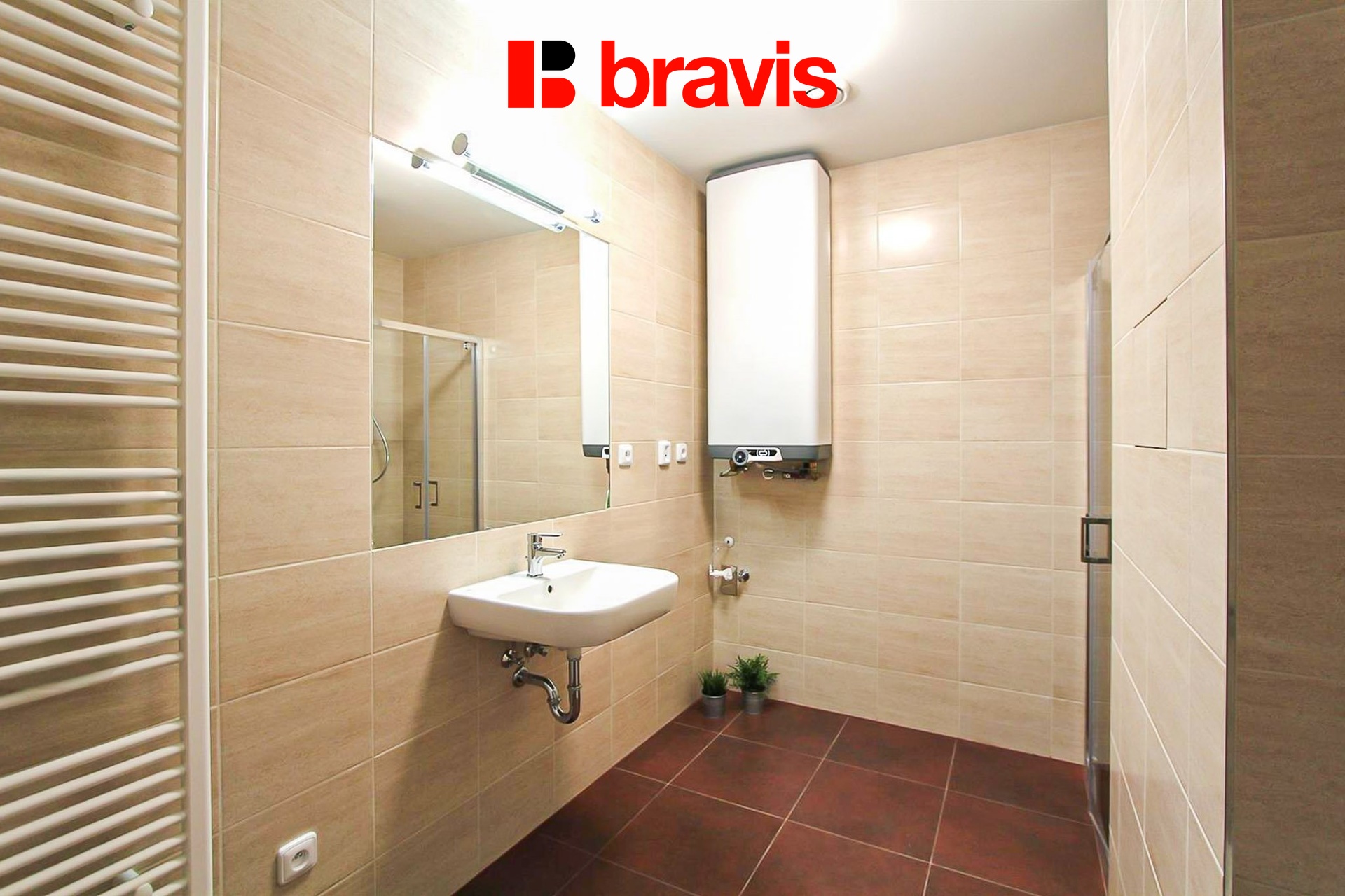 V koupelně je sprchový kout, umyvadlo, toaleta, otopný žebřík, boiler a přípojka na pračku.
