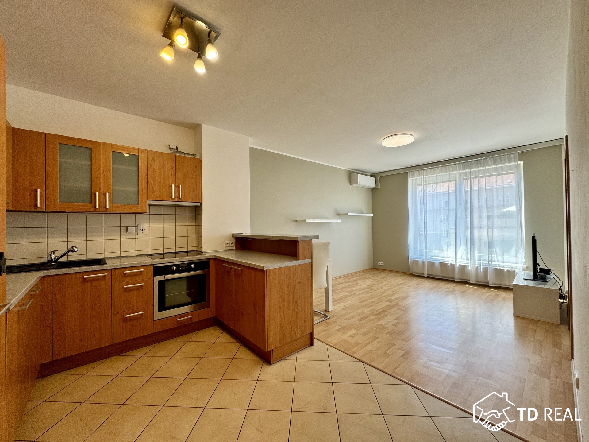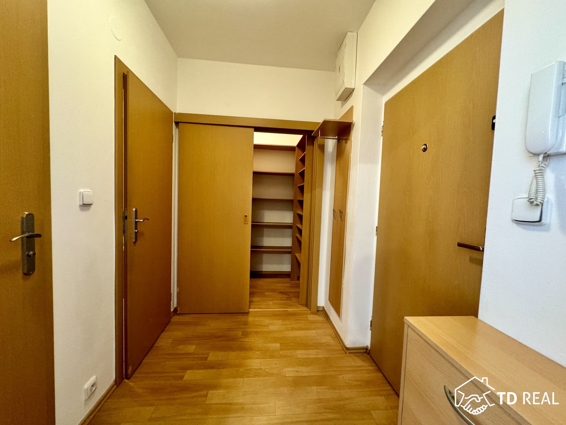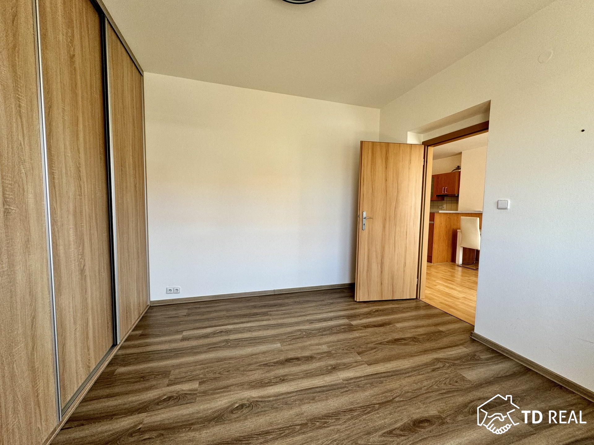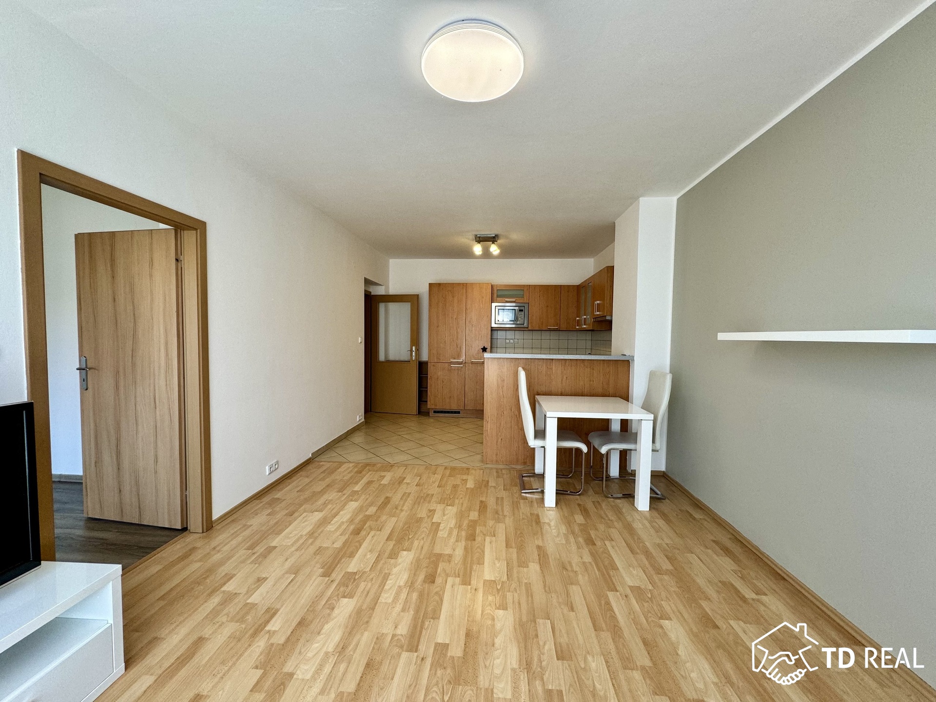 Dispozice: vstupní chodba se vstupy do obývacího pokoje s kk, koupelna, toaleta je zvlášť, šatna. Obývací pokoj je průchozí do ložnice, z ložnice je vstup na balkon. Byt disponuje klimatizací.