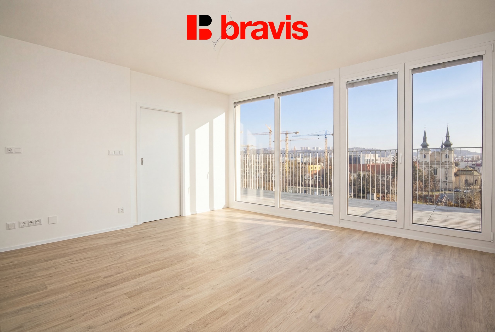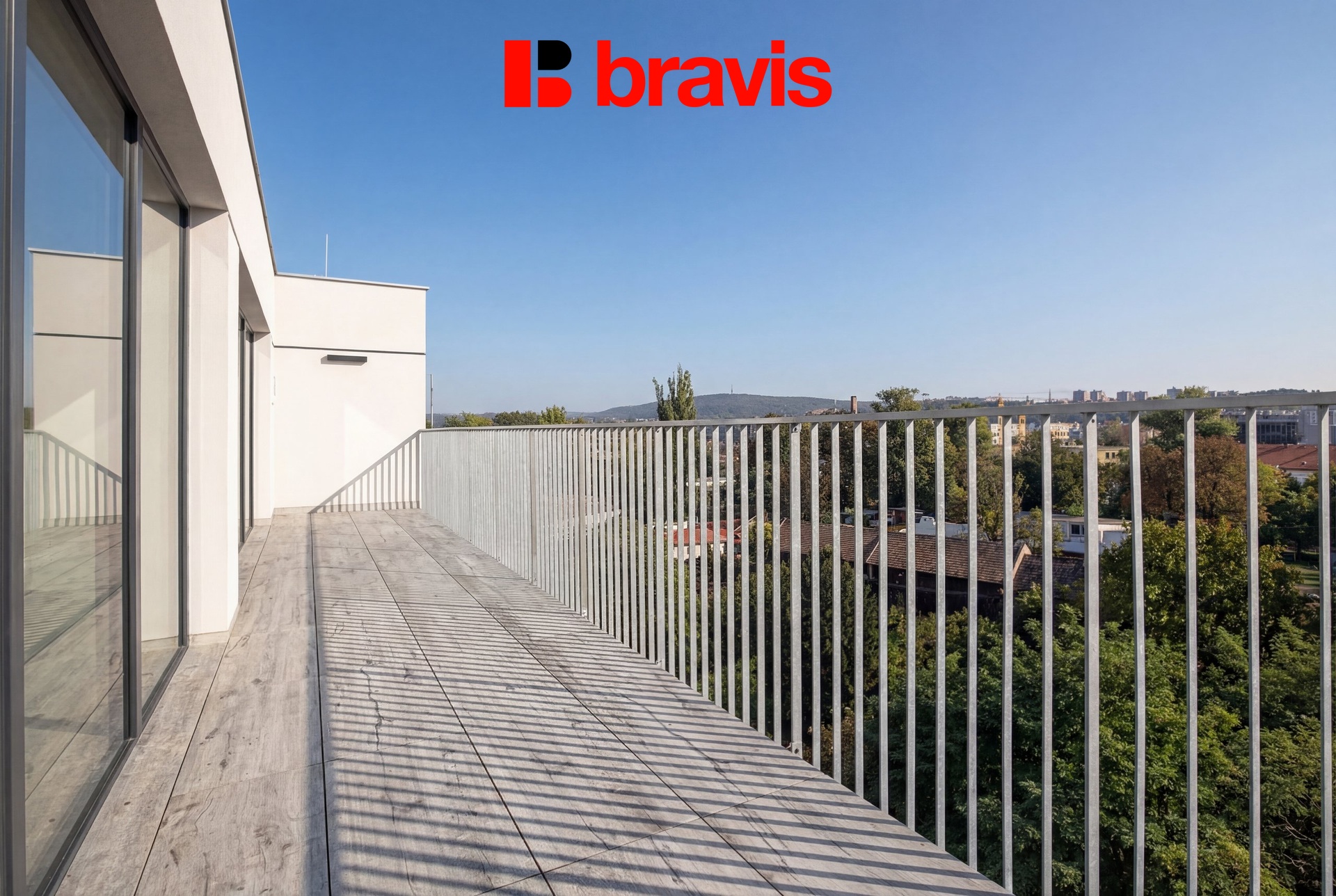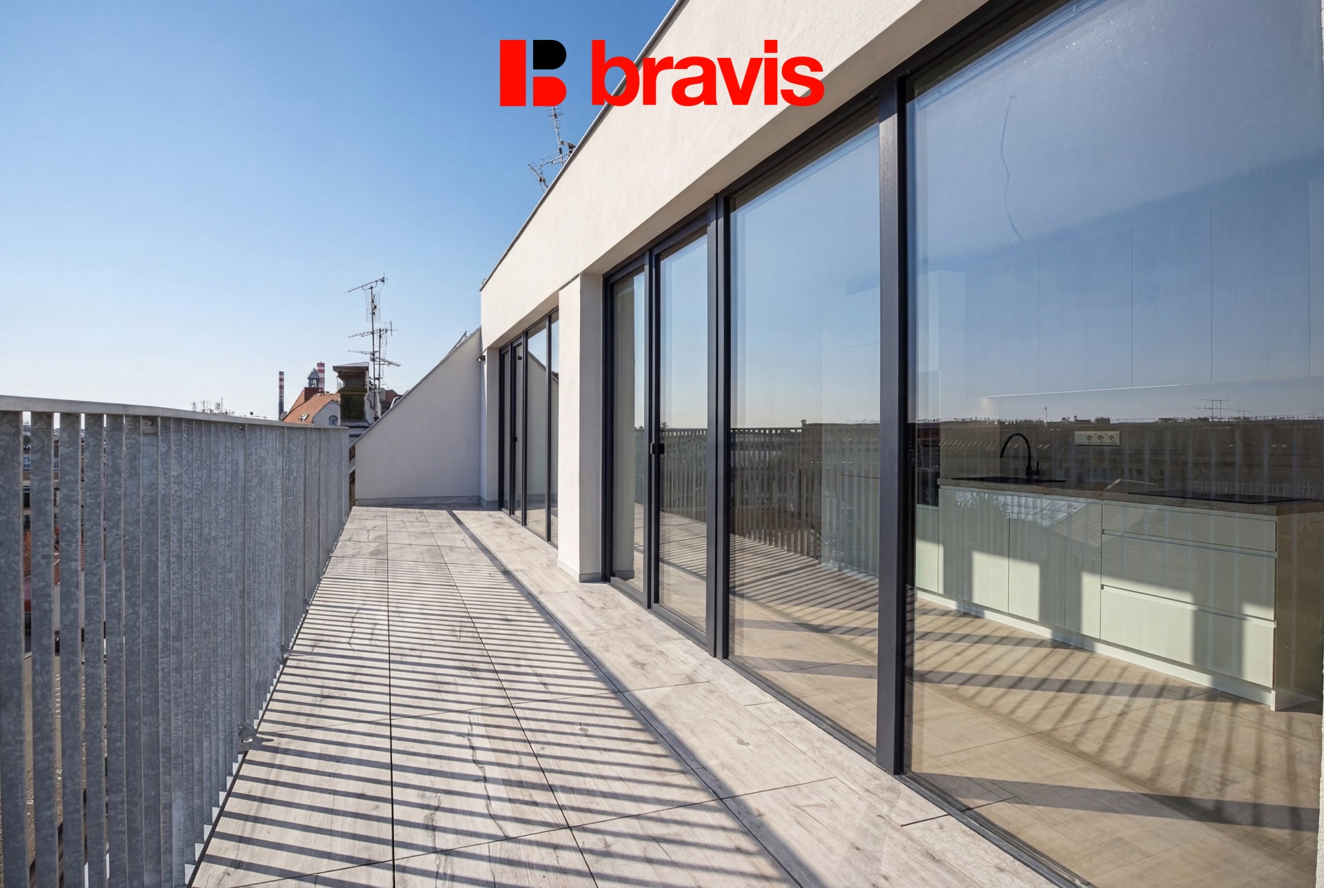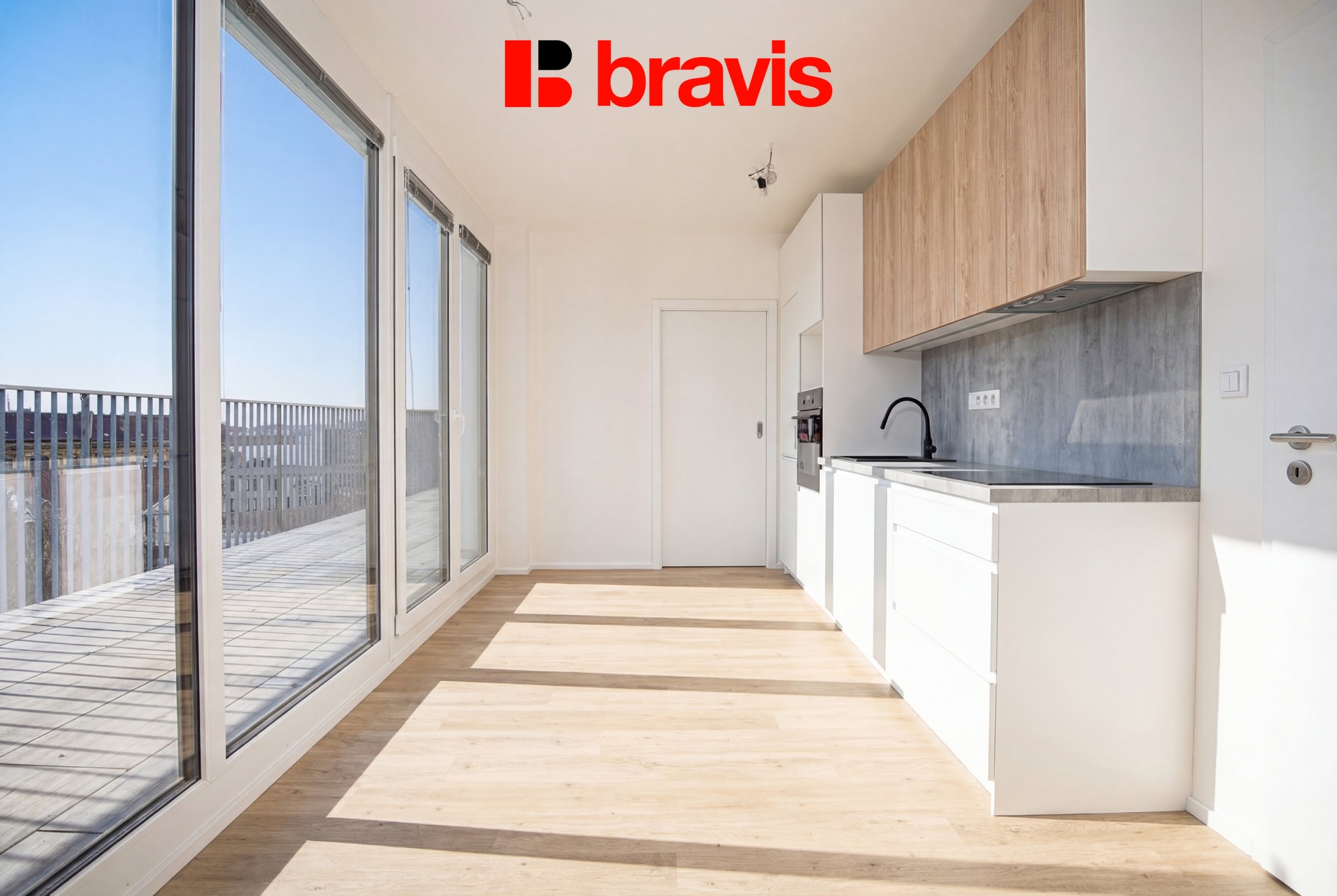 Z obývací části je přímý vstup na terasu, která nabízí orientaci na areál Nové Zbrojovky – ideální místo pro ranní kávu nebo večerní posezení.