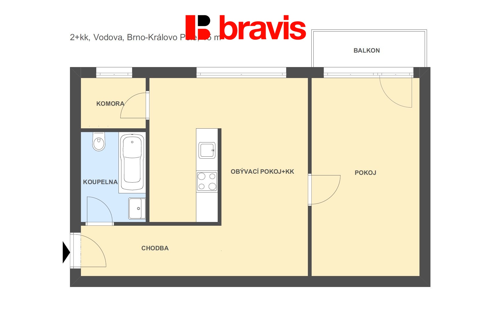 Byt se skládá z pokoje s kuchyňským koutem (kuchyně je vybavená kuchyňskou linkou s el. troubou, el. varnou deskou), pokoje (bez vybavení) se vstupem na balkon, koupelny ( vanou,umyvadlem a toaletou) a komory, ve které se nachází kotel a připojení na pračku.