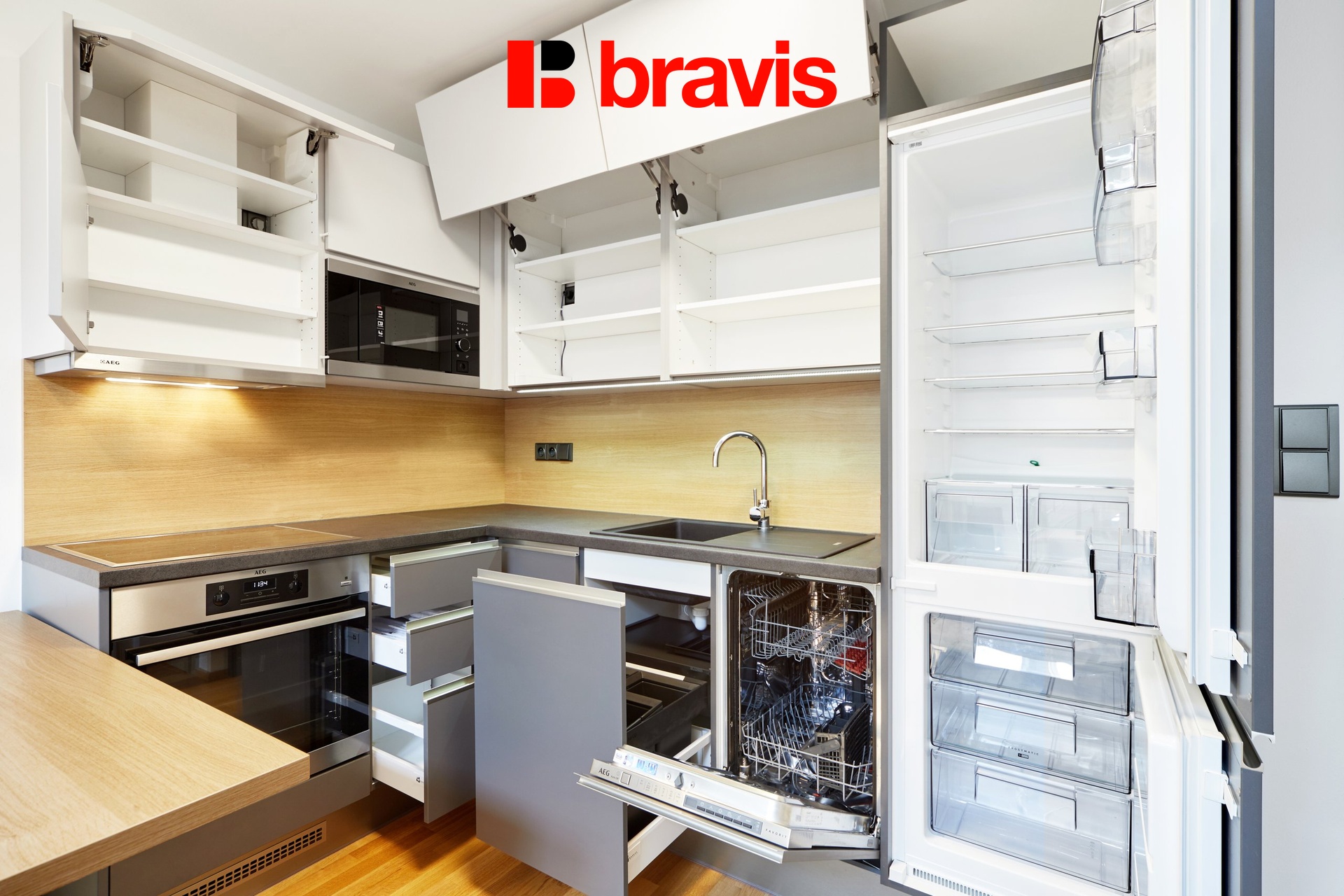 Vybaven je moderní kuchyňskou linkou se spotřebiči (varná deska, pečící trouba, digestoř, mikrovlnná trouba, chladnička, myčka nádobí, pračka, jídelní stůl), vestavěnými skříněmi, postelí s rošty a matracemi, obývací stěnou a světly.