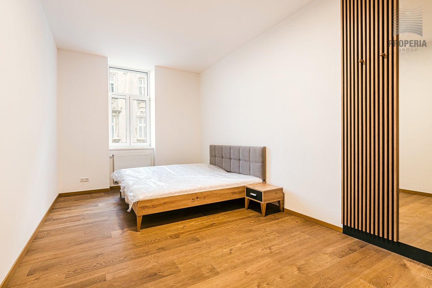 Při vstupu do bytu se ocitneme v předsíni, ze které vede vstup do jednotlivých místností. V předsíni se nachází vestavná skříň. Kuchyň je vybavena linkou s vestavnými spotřebiči (varná deska, trouba, myčka, lednice, digestoř). Ložnice je zařízena manželskou postelí s matrací a vestavnou skříní. Koupelna a WC jsou společné, umístěné u vchodu do bytu. K bytu náleží sklep.