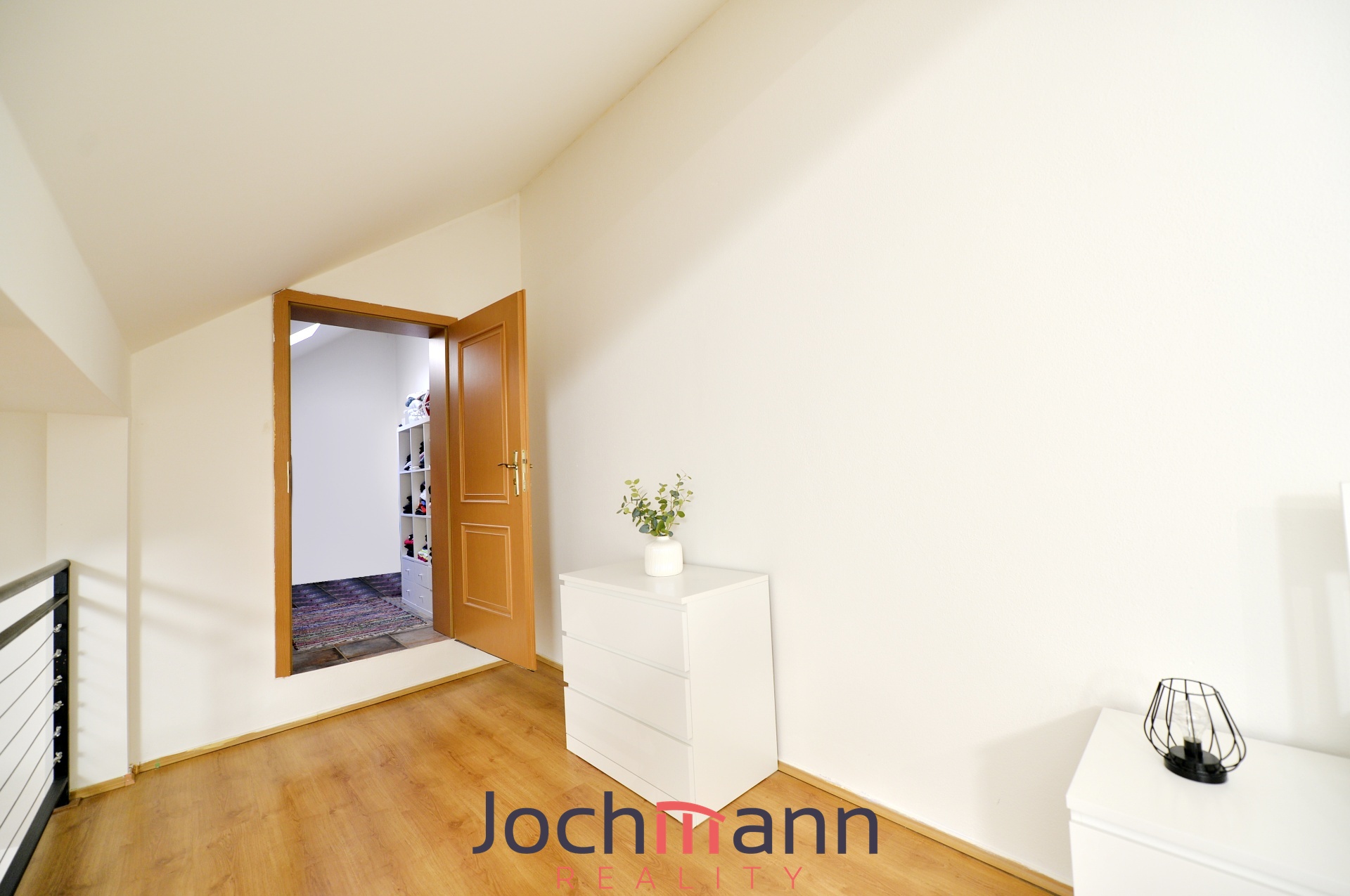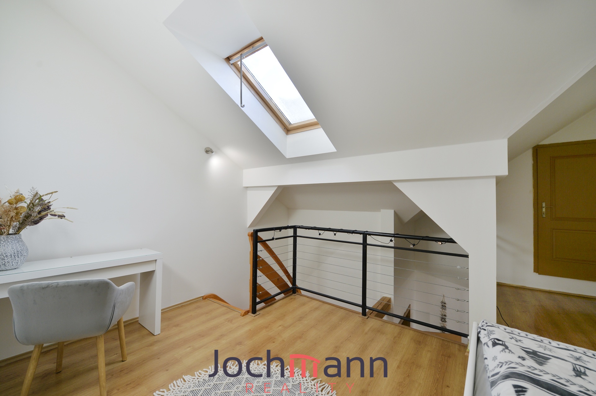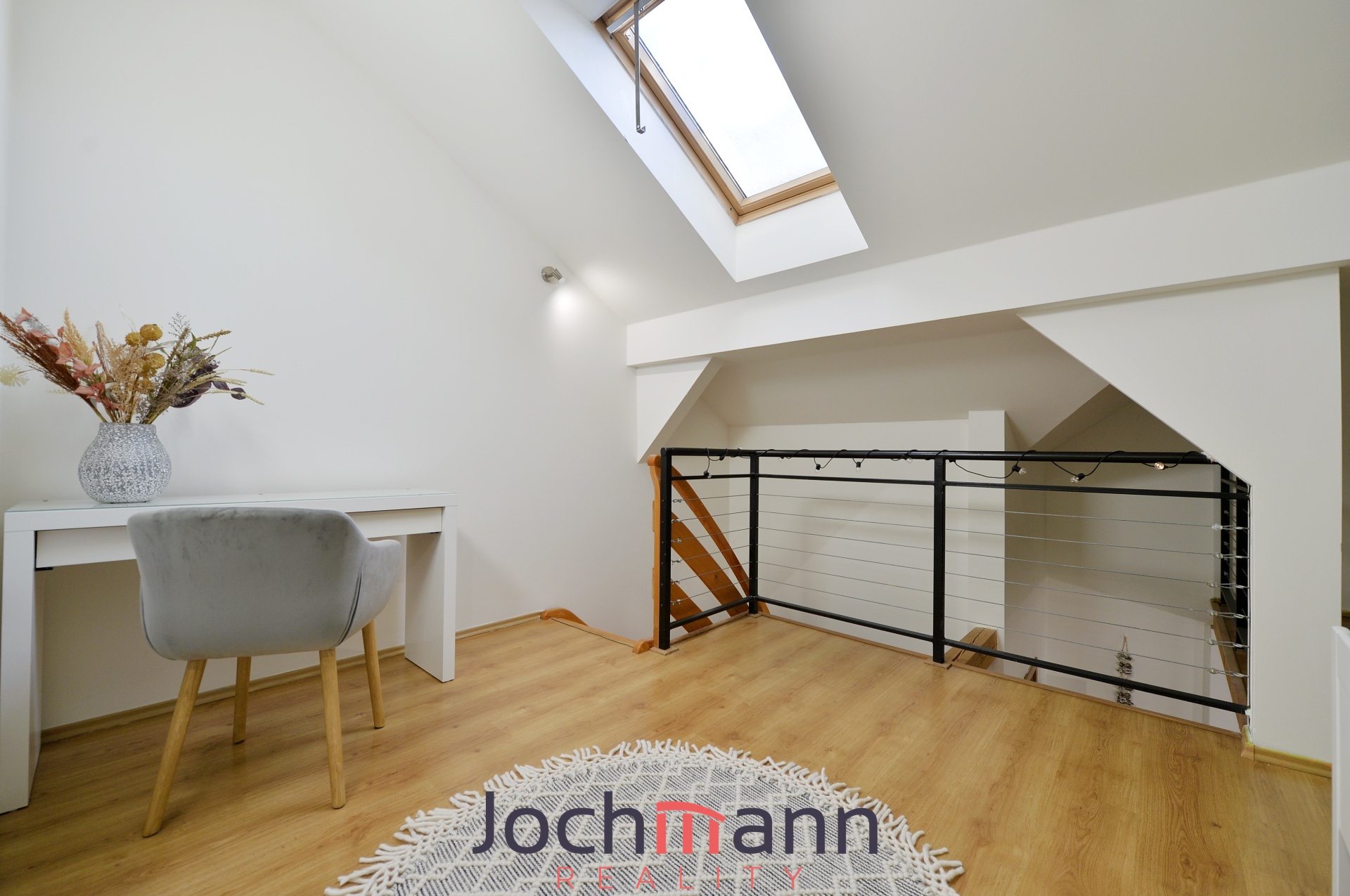 Byt je prakticky řešený, ve spodním podlaží najdete vstupní chodbu, prostorný obývací pokoj s kuchyňským koutem a moderní koupelnu se sprchovým koutem. Po dřevěném schodišti se dostanete do horního patra, kde je dostatek prostoru pro ložnici i pracovní zónu. Součástí podkroví je také velká šatna, která nabízí dostatek úložného prostoru.