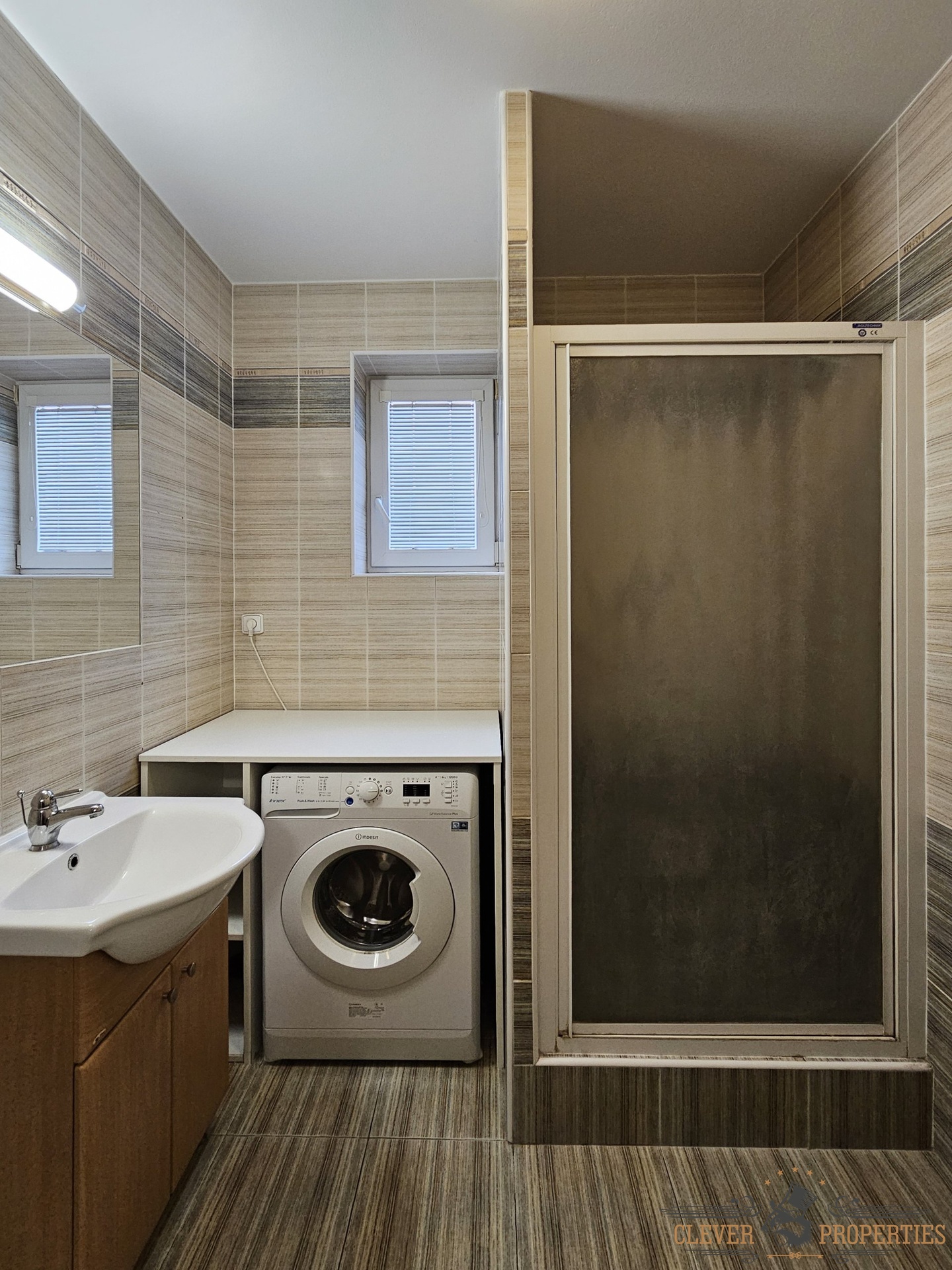 Z chodby projdete jak do koupelny, která má sprchový kout, WC, pračku a dostatek místa na sušičku, tak do velmi prosvětlené kuchyně s obývací částí.