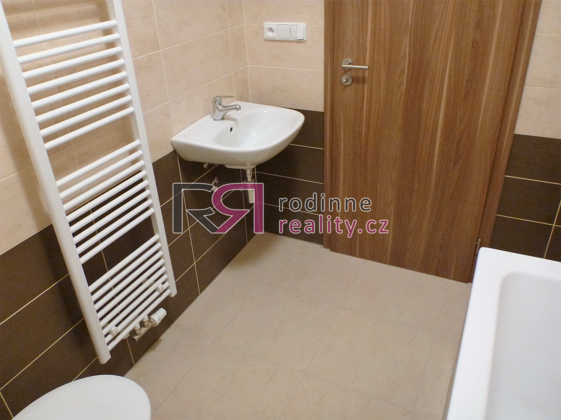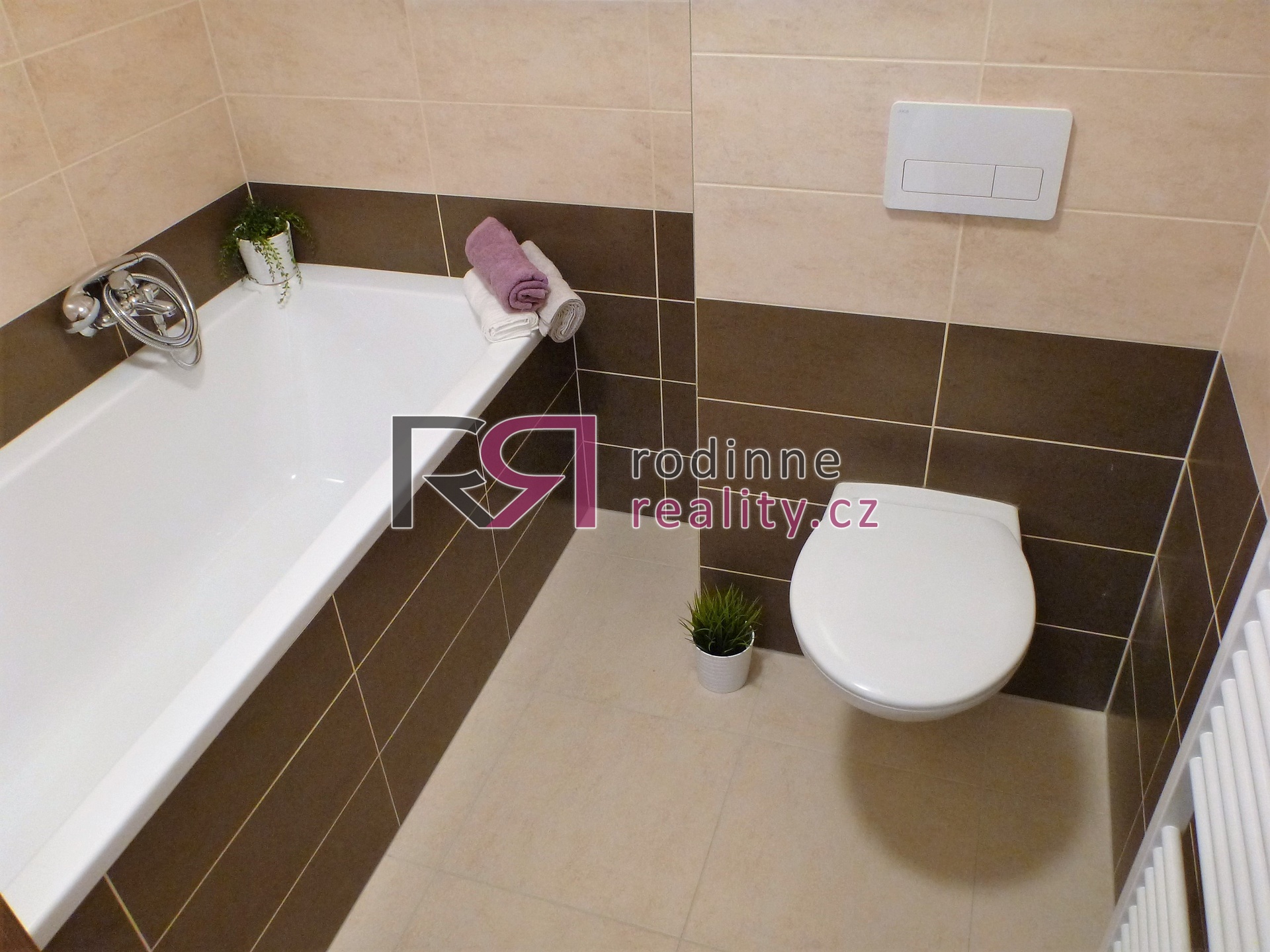 Na podlahách kombinace plovoucí podlahy a dlažby a k bytu patří také sklep, takže lyže, kola nebo sezónní věci nemusí bydlet s Vámi v obýváku.