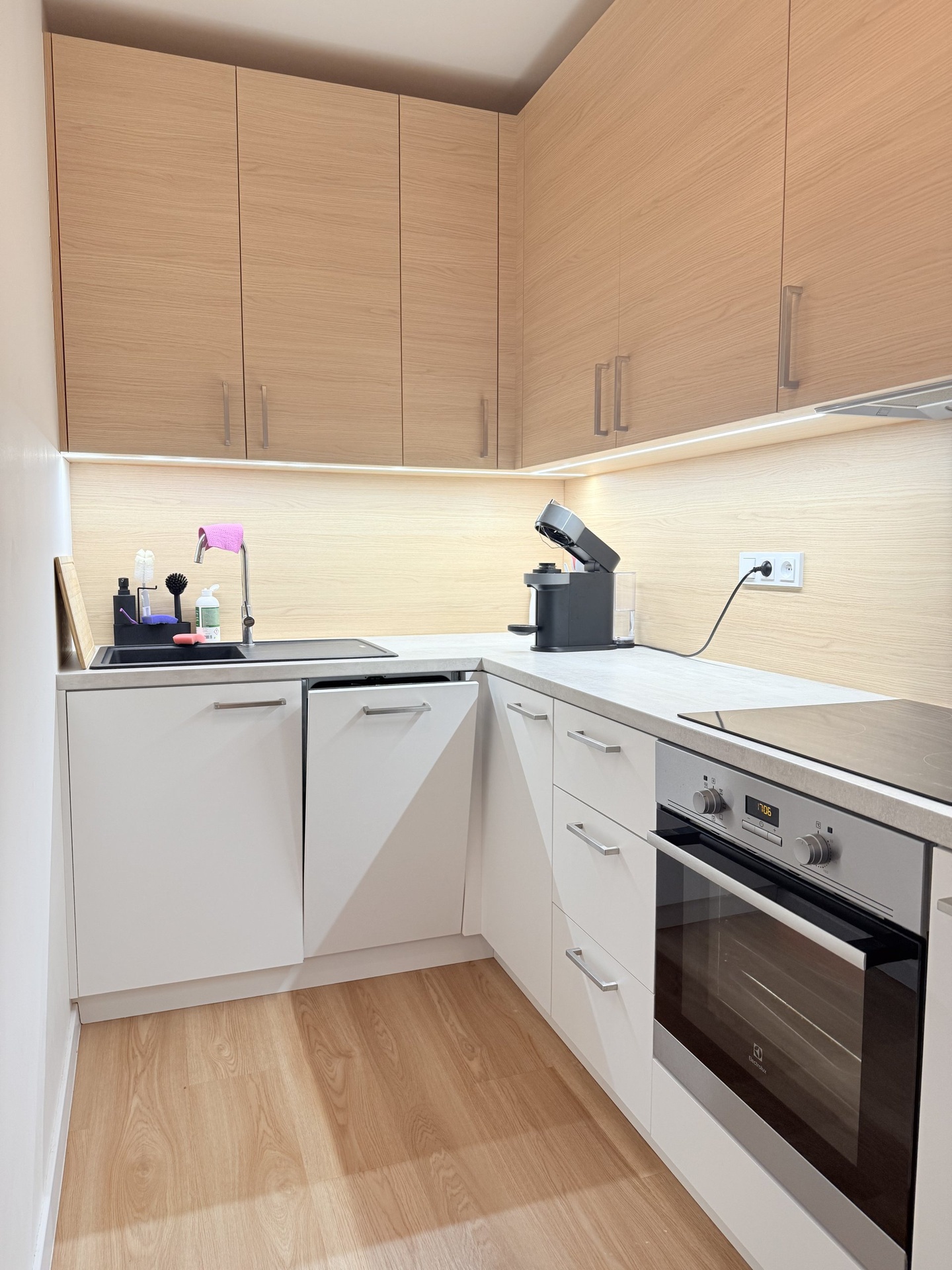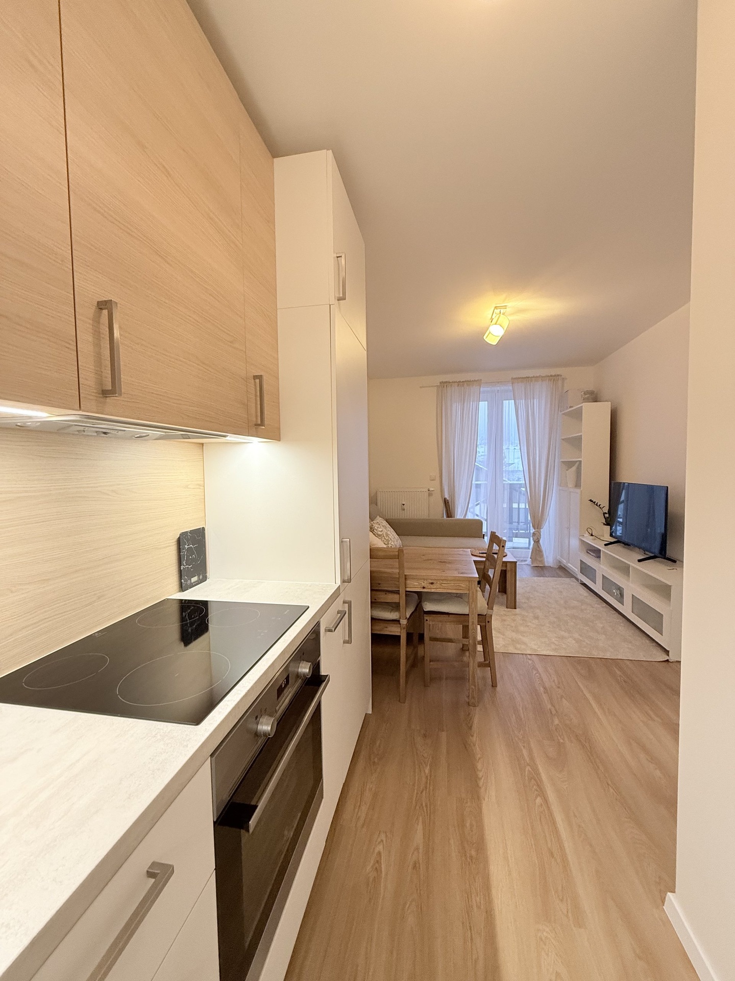 Dispozice bytu: kuchyň s vestavnými spotřebiči (myčka, lednice, indukce s troubou)