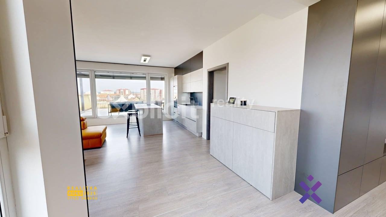 Interiér bytu je řešen s důrazem na detail a maximální komfort bydlení. Byt je vybaven nábytkem na míru v prvotřídní kvalitě, který dokonale ladí s moderním designem celého prostoru. Dominantou je stylová kuchyňská linka s moderními spotřebiči, která splní požadavky i náročnějších klientů.