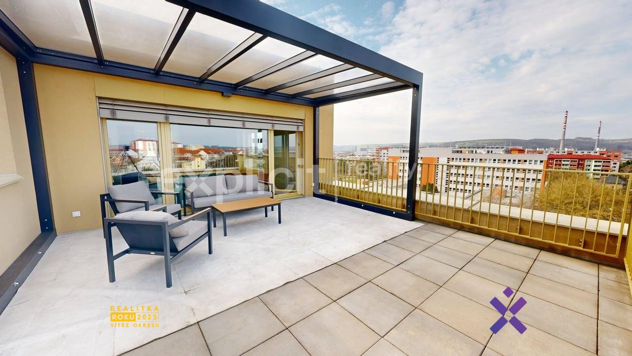 Největší předností této nemovitosti je bezesporu rozlehlá terasa o velikosti 45 m², která poskytuje naprosto výjimečný venkovní prostor. Terasa je zastřešena moderní hliníkovou pergolou a je prakticky rozdělena na dvě samostatné části, což umožňuje variabilní využití, například oddělené zóny pro relaxaci a posezení s přáteli.