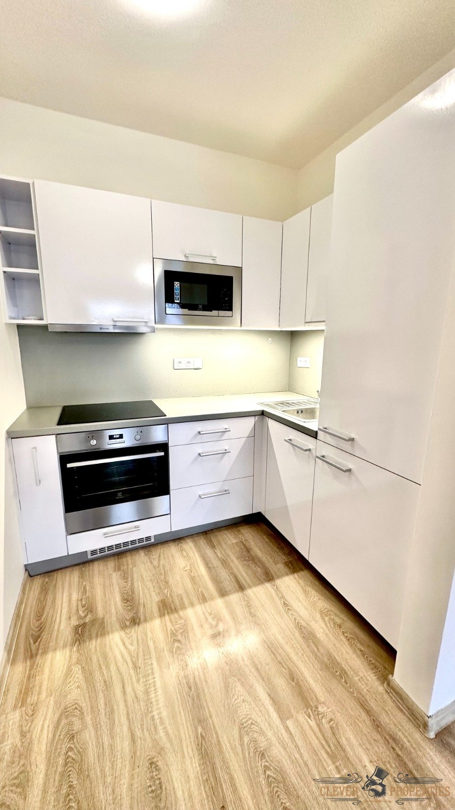 Srdcem bytu je světlý obývací prostor s kuchyňským koutem, který nabízí dostatek místa pro každodenní život i odpočinek. Kuchyň je vybavena vestavěnými spotřebiči – lednicí s mrazákem, troubou, varnou deskou a mikrovlnnou troubou – takže se můžete rovnou nastěhovat a bydlet.