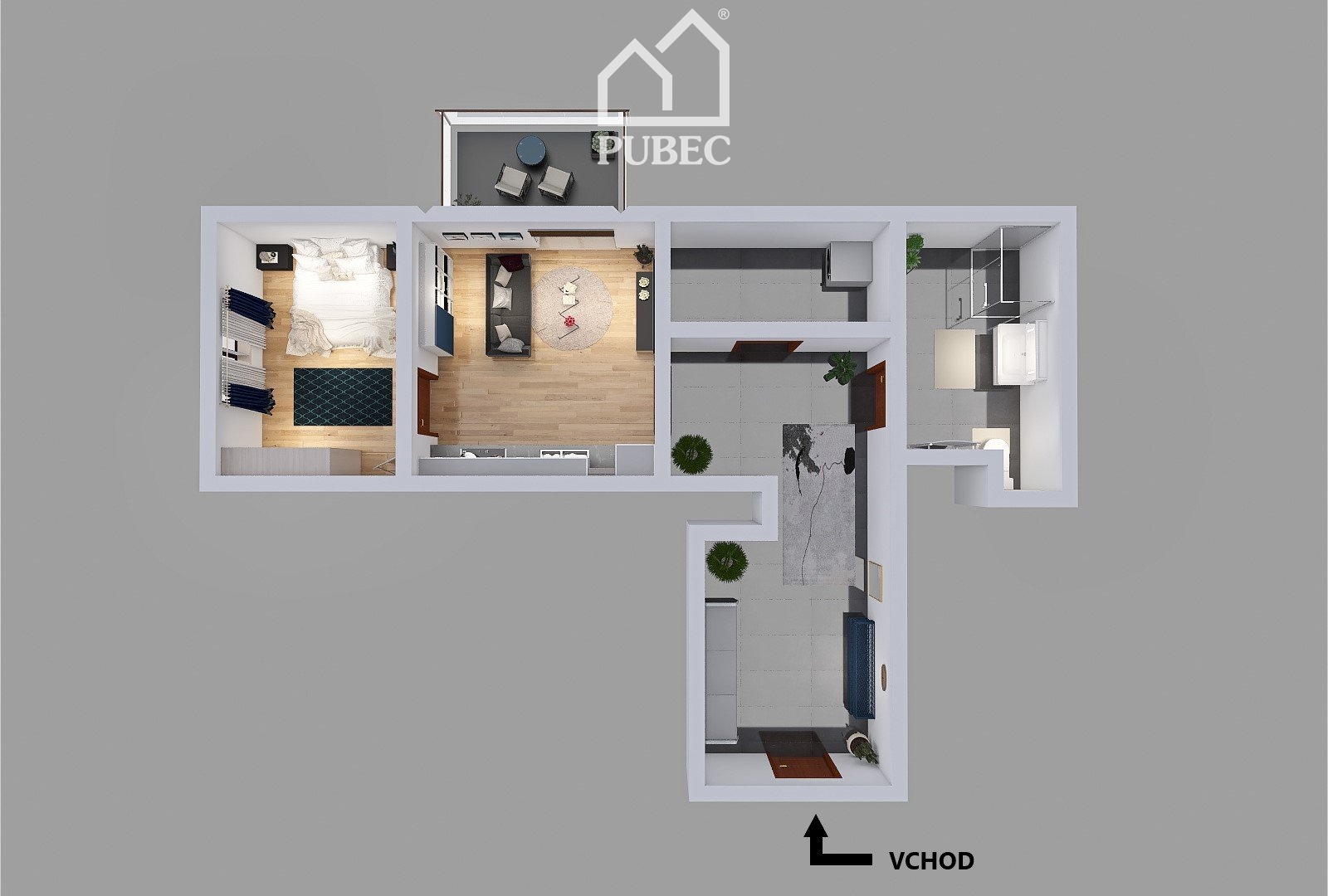 Dispozičně je byt rozdělen na předsíň s prostorem pro šatní skříň, koupelnu se sprchovým koutem, umyvadlem a WC, technickou místnost, ložnici a obývací prostor s moderní kuchyňskou linkou vč. vestavných spotřebičů (lednice s mrazákem, varná deska, trouba, digestoř, MW, myčka). Součástí nabídky je ještě praktická komora umístěná na patře
