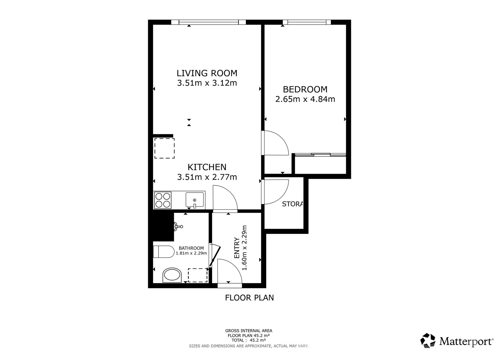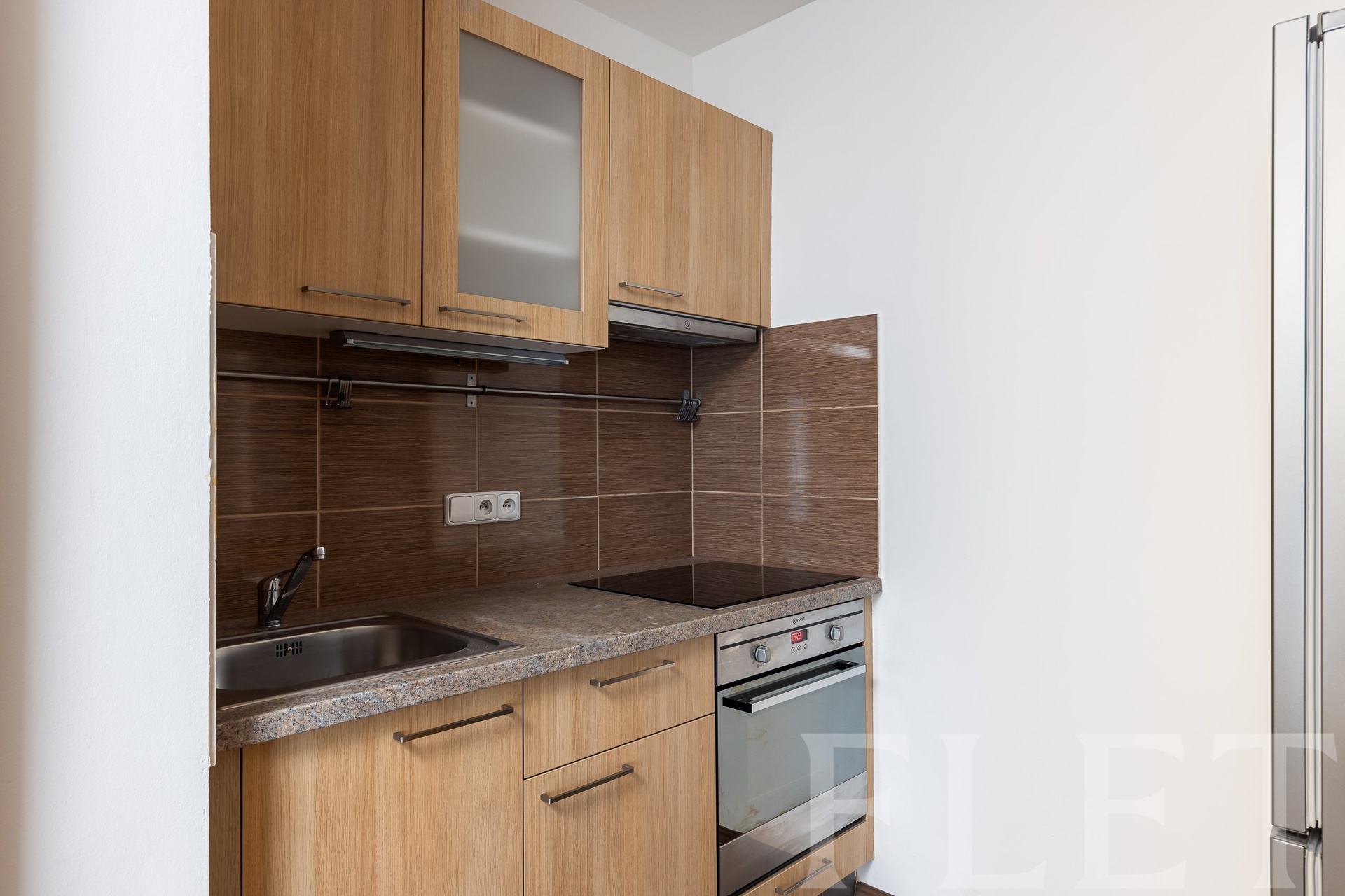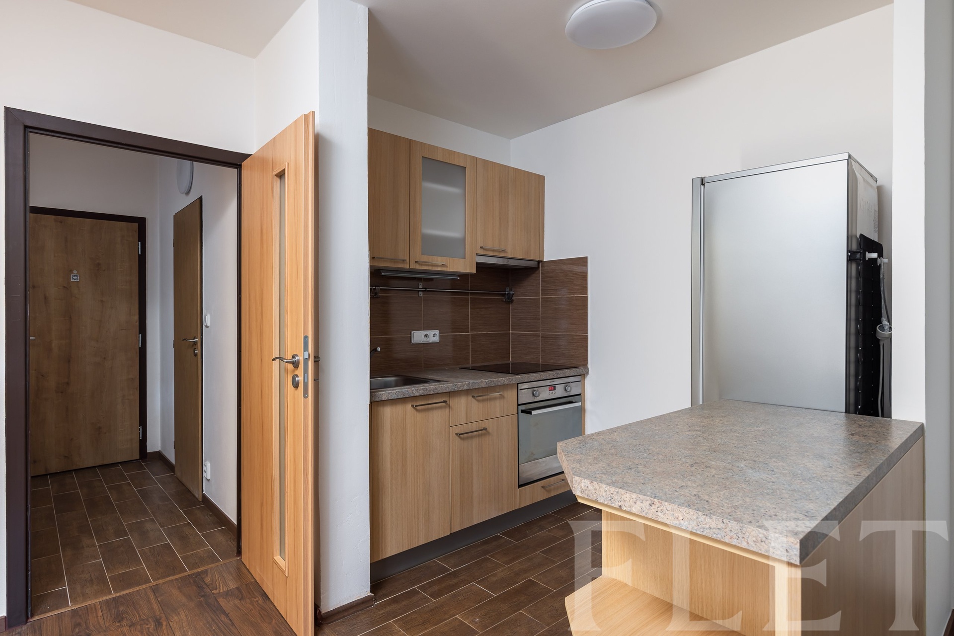 Samotný byt se pak skládá ze dvou místností jejichž dominantou jsou krásné tmavé podlahy a výhled do dalekého okolí. V jedné z nich se nachází kuchyňský kout s elektrickou troubou, varnou deskou a velkou lednicí s mrazákem. Je zde i dostatek prostoru pro zřízení jídelní i obytné části. Součástí je také velká komora, která zajistí extra úložný prostor. Druhá místnost může sloužit například jako útulná ložnice a je vybavena vestavnou šatní skříní. Z předsíně se dostanete do koupelny se sprchovým koutem, toaletou a předem plněnou pračkou.