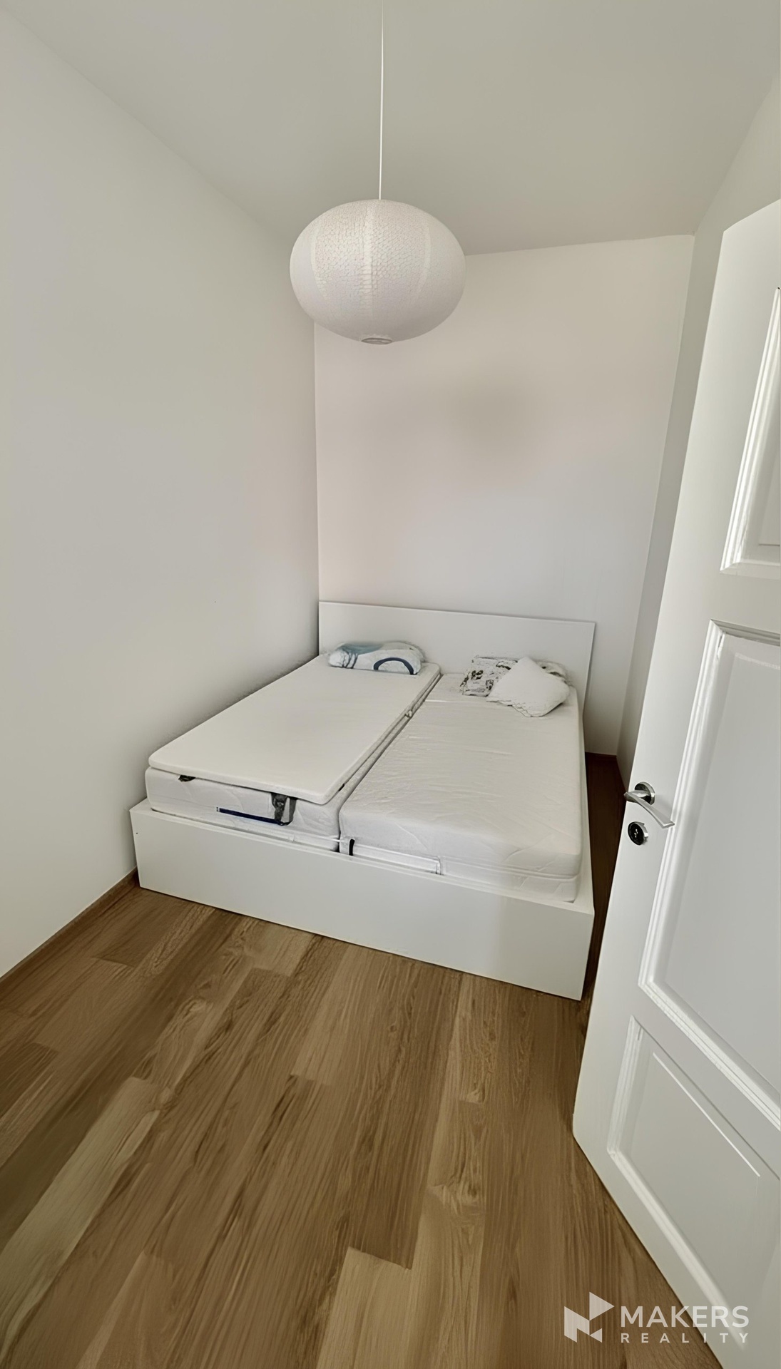 Podlahu pokrývá kvalitní dřevěný laminát. Pokoj je navržen v jednoduchém, čistém stylu s bílými stěnami a závěsným osvětlením, které dodává prostoru svěžest a pohodlí. Je ideální pro odpočinek a nabízí dostatek prostoru pro osobní věci.