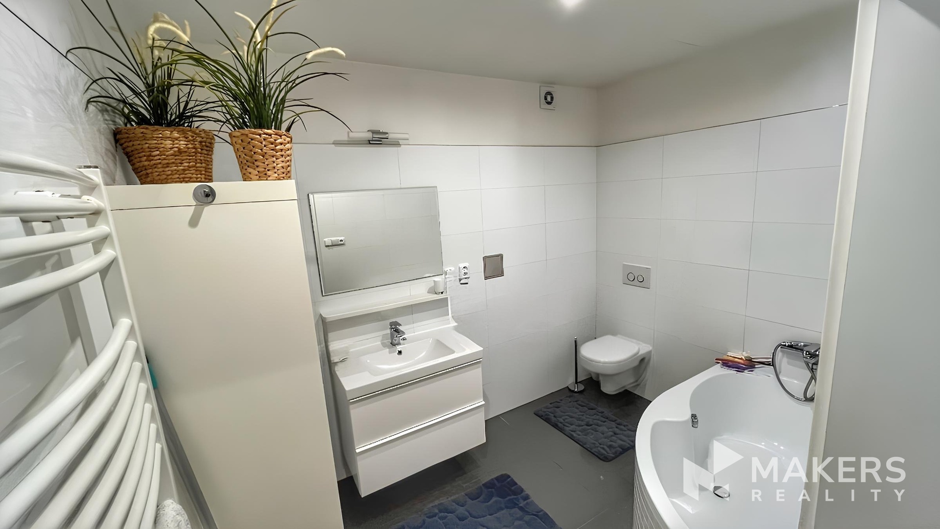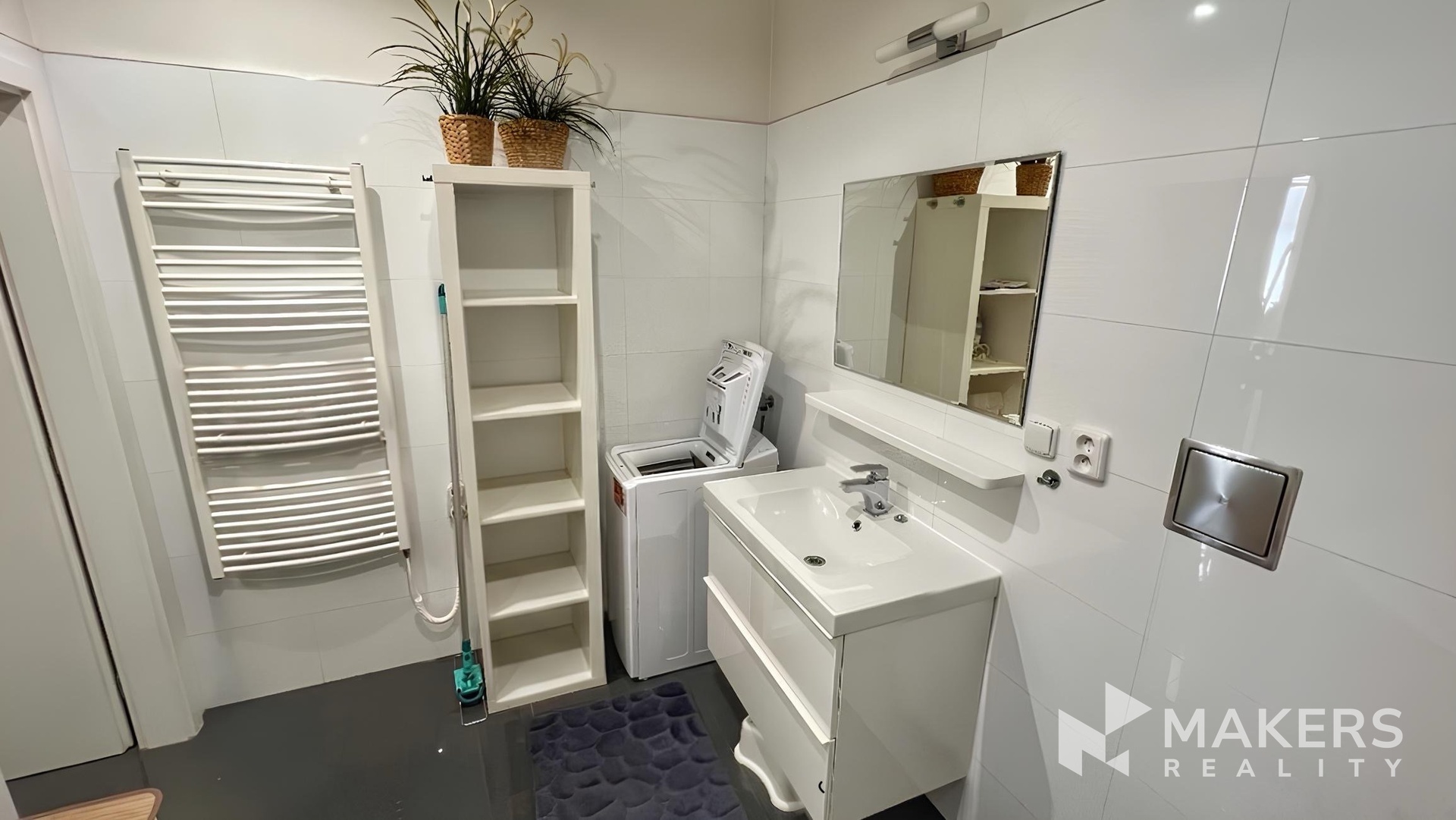 Koupelna je moderně zařízená, prostorná a světlá. K dispozici je rohová vana, závěsné WC a umyvadlo se spodní skříňkou a zrcadlem s osvětlením. Součástí vybavení je také vysoká úložná skříň, praktický topný žebřík a pračka.