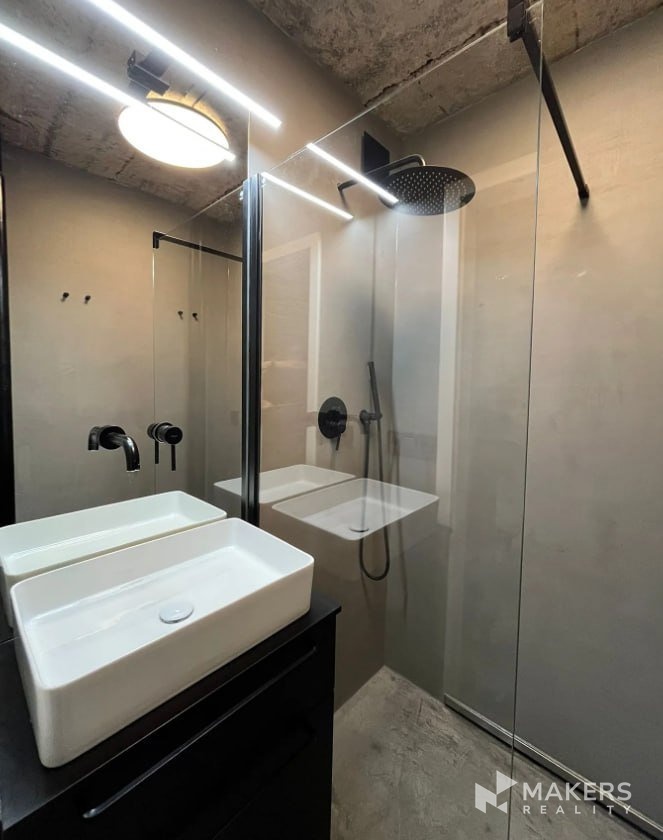 Elegantní koupelna s moderním sprchovým koutem a nadčasovými černými detaily. Minimalistický design a použití kvalitních materiálů vytváří příjemnou atmosféru i praktický prostor pro každodenní využití. Velké zrcadlo a přirozené tóny podtrhují celkovou vzdušnost a styl interiéru.