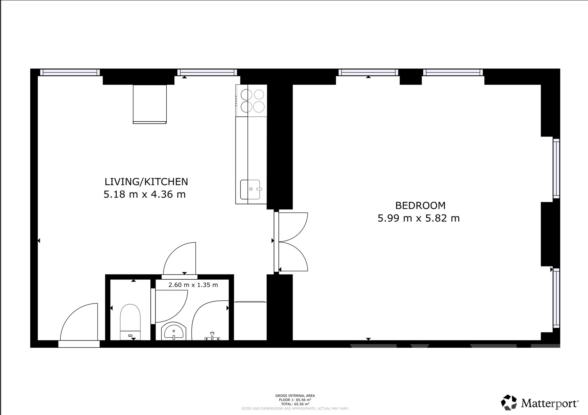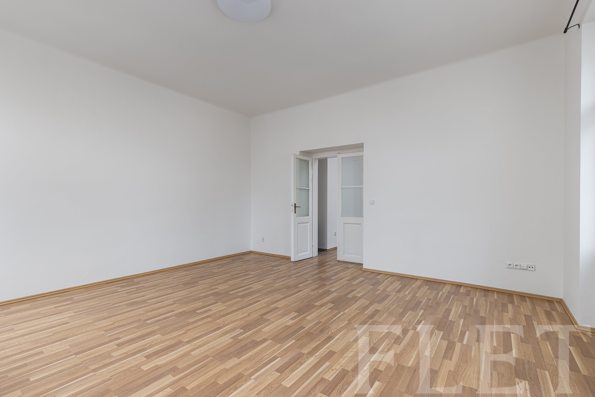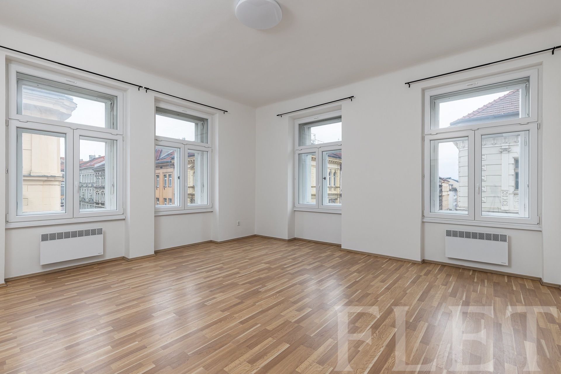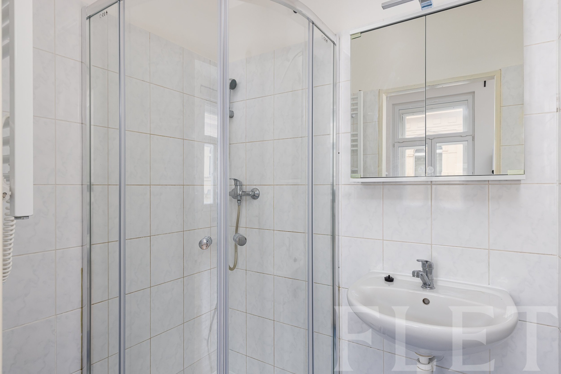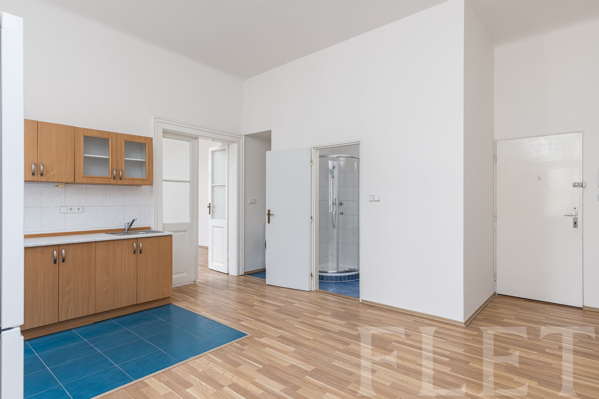 Dispozice 2+kk zahrnuje světlou hlavní obytnou místnost a prostorný pokoj s kuchyňským koutem vybaveným sporákem a varnou deskou. Velká okna s výhledem do krásné okolní zástavby dodávají celému bytu příjemně otevřenou a vzdušnou atmosféru. V koupelně je k dispozici sprchový kout a toaleta.