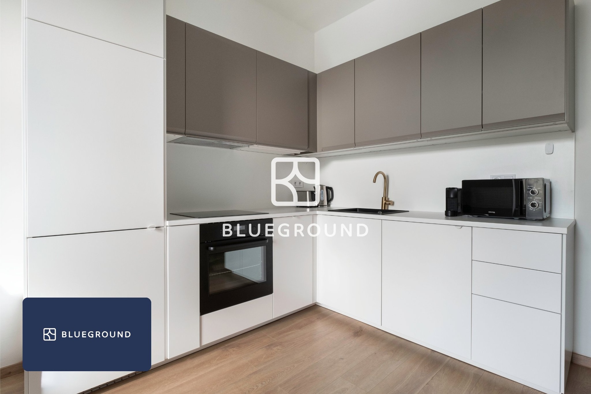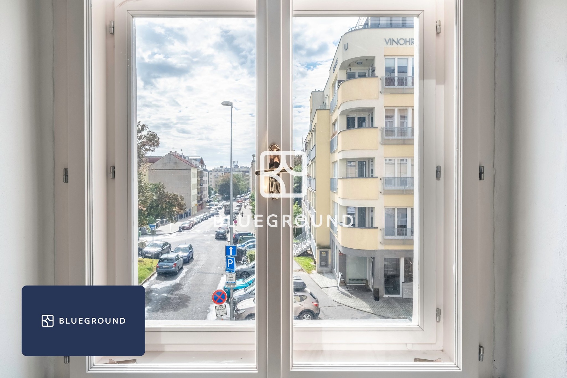 Blueground nabízí plně zařízený byt 2+kk k pronájmu v Praze 10, dostupný pro pobyty od jednoho měsíce.