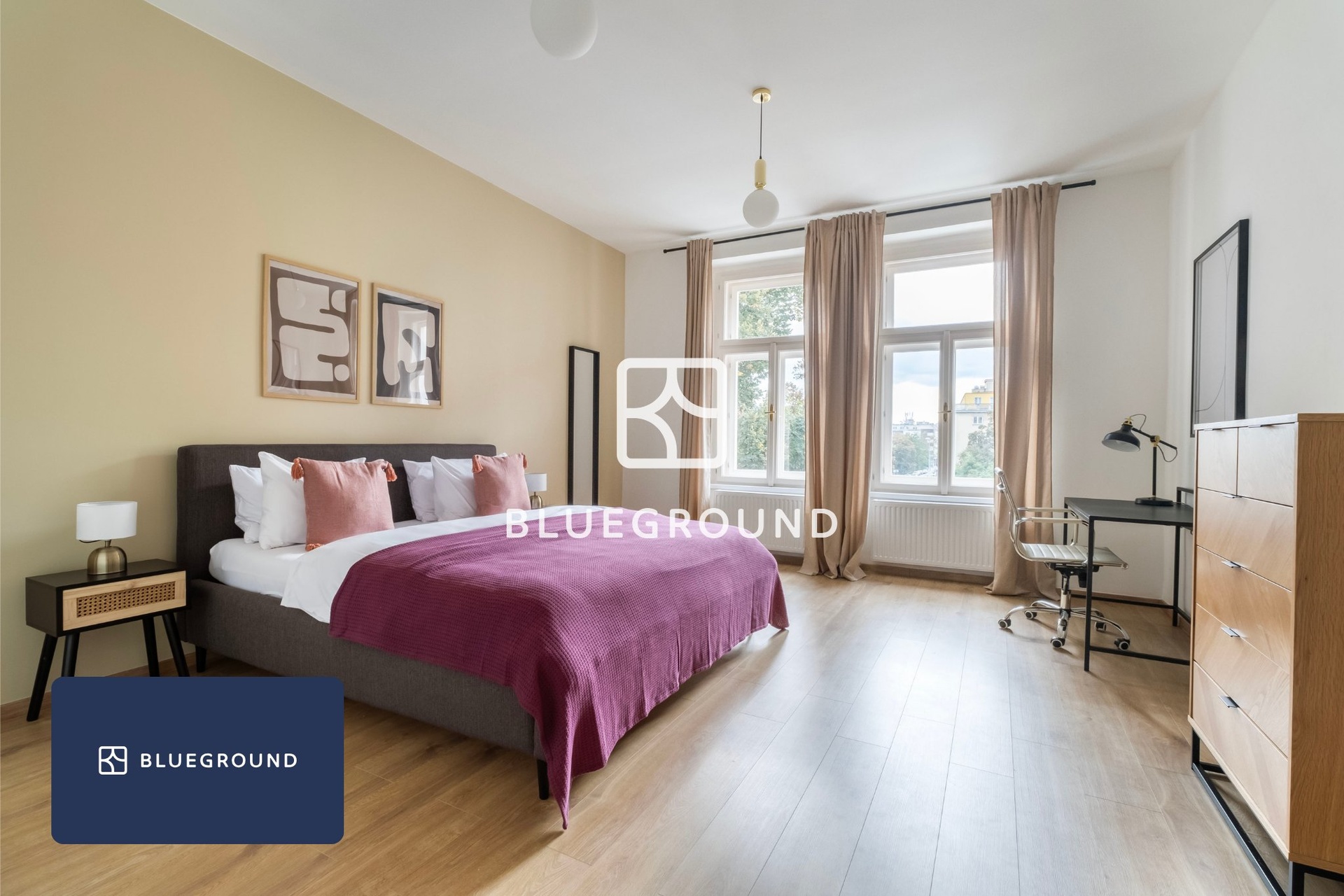 Blueground nabízí plně zařízený byt 2+kk k pronájmu v Praze 10, dostupný pro pobyty od jednoho měsíce.