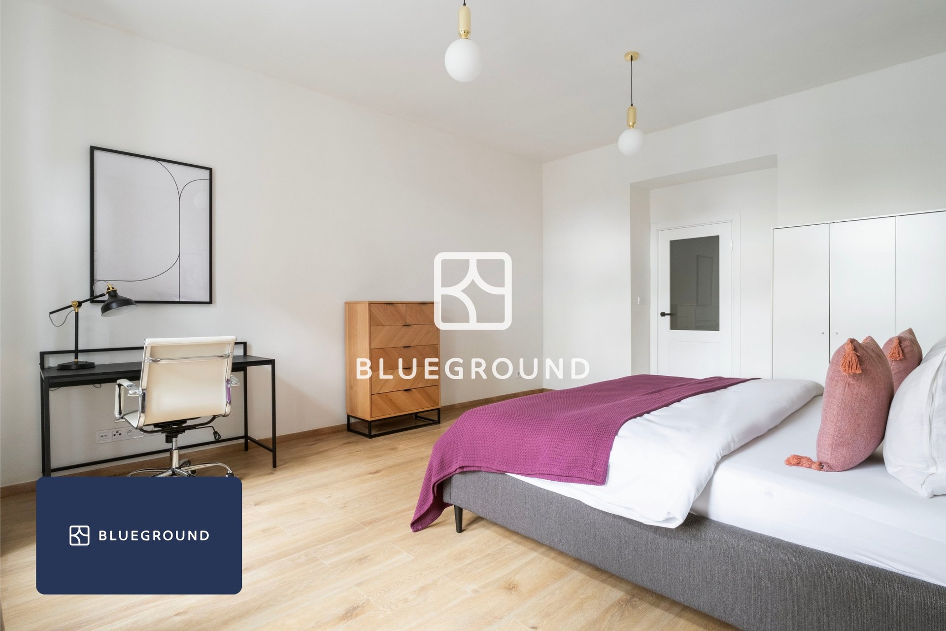Blueground nabízí plně zařízený byt 2+kk k pronájmu v Praze 10, dostupný pro pobyty od jednoho měsíce.