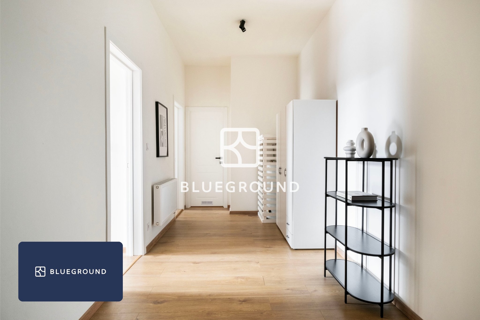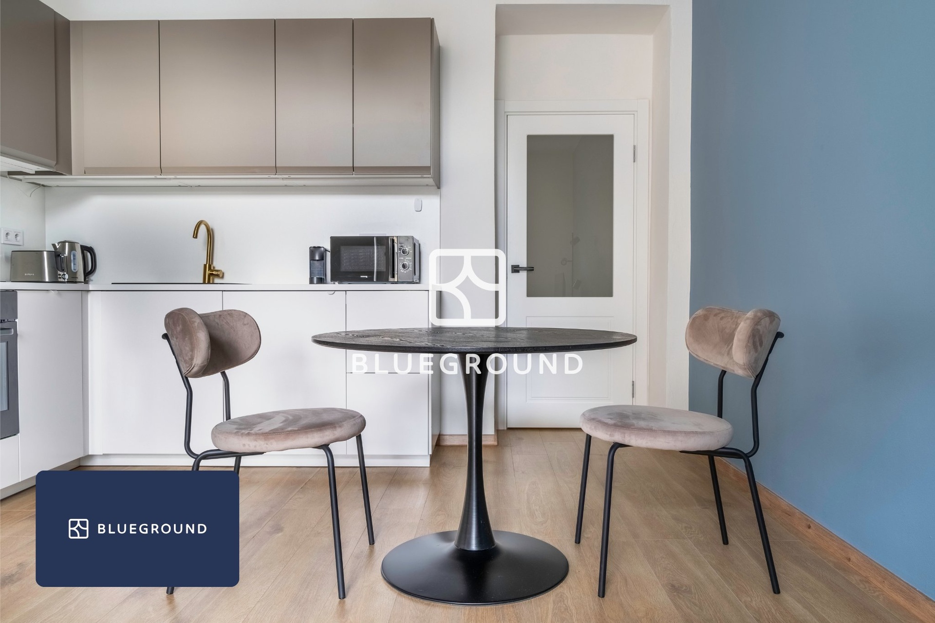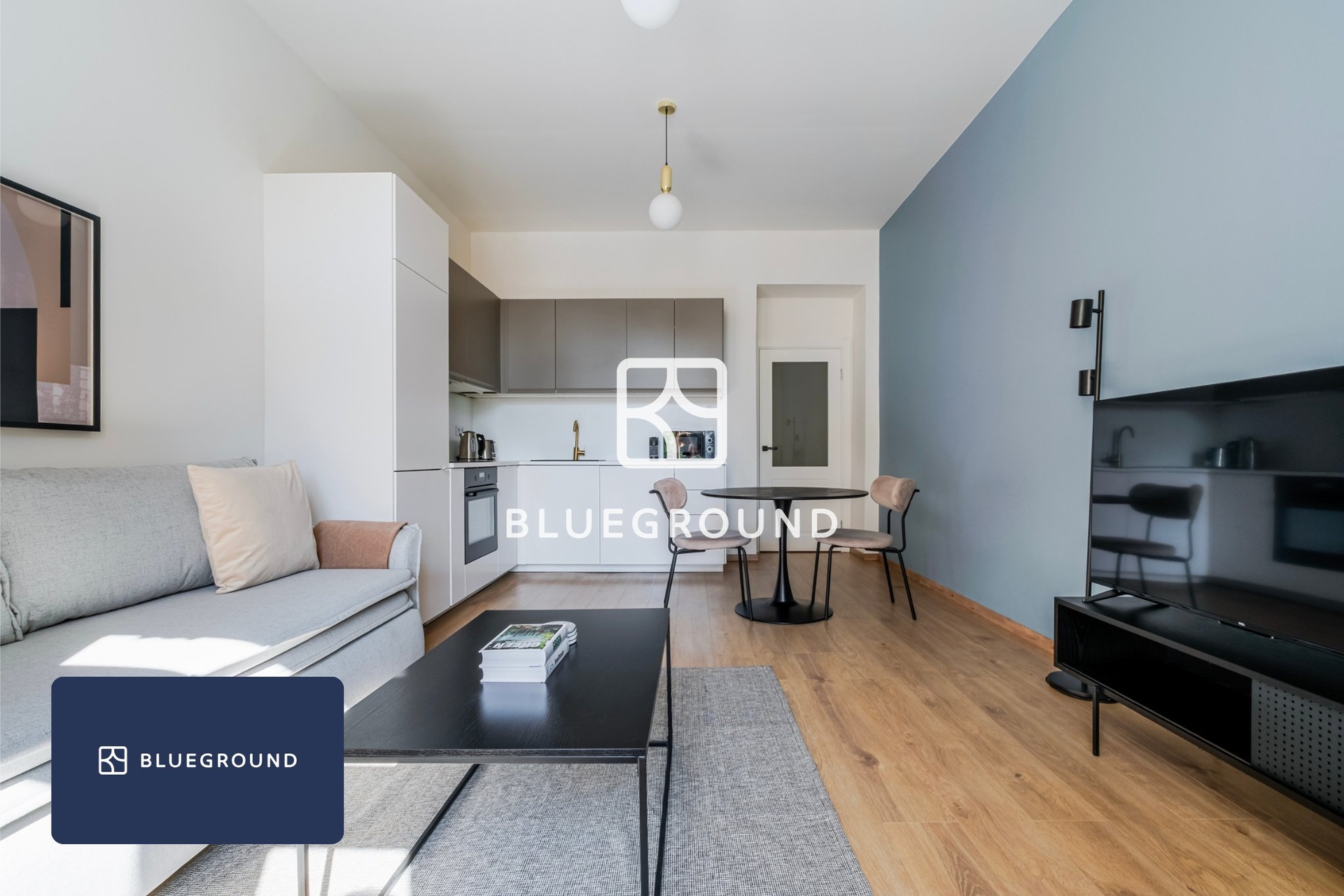 Blueground nabízí plně zařízený byt 2+kk k pronájmu v Praze 10, dostupný pro pobyty od jednoho měsíce.