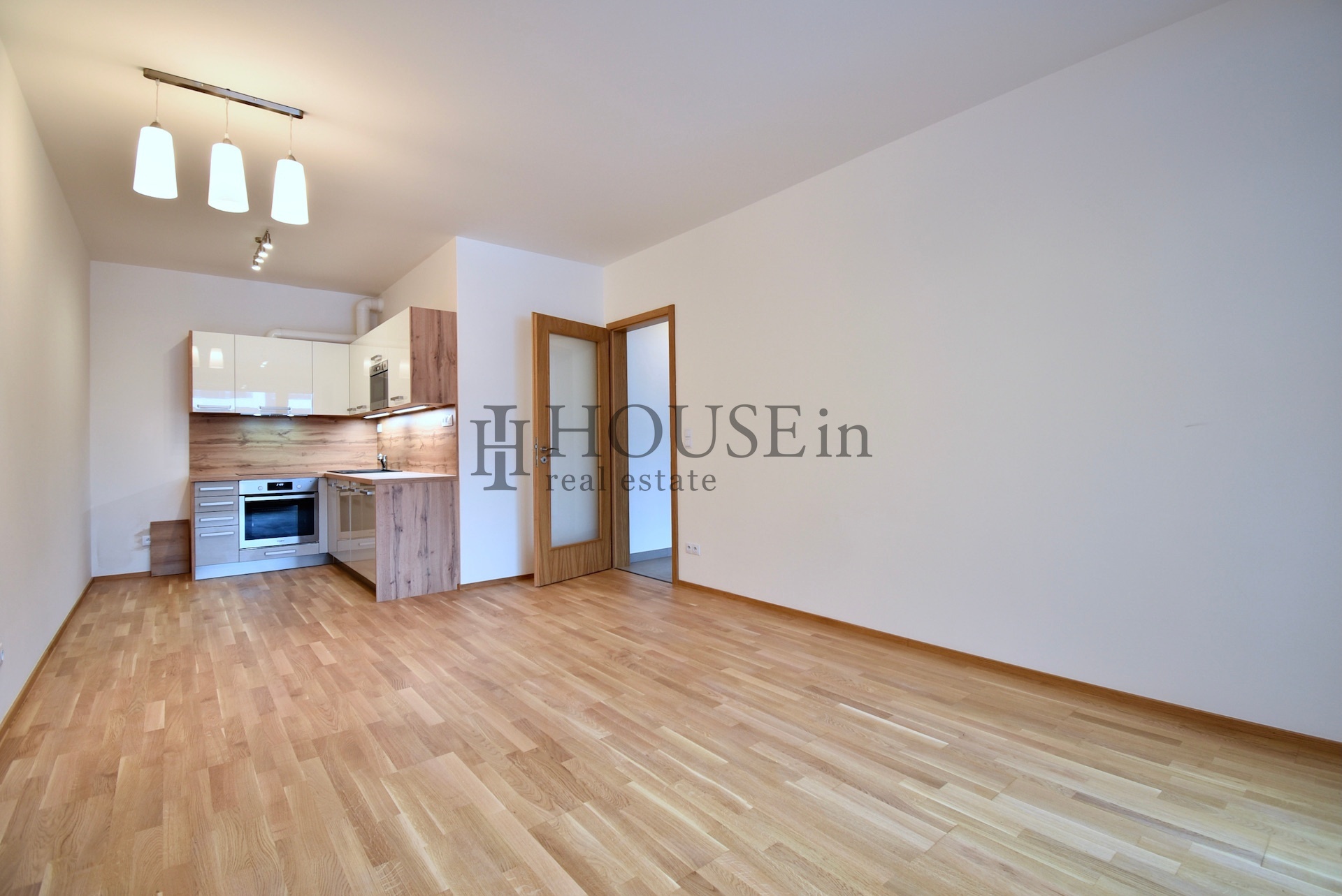 Vstupní předsíň s šatní stěnou a vestavnou skříní, koupelna s vanou, toaletou, umyvadlem a topným žebříkem, obývací pokoj s kuchyňským koutem a moderní kuchyňskou linkou vybavenou vestavnými spotřebiči (indukční varná deska, trouba, mikrovlnná trouba, myčka nádobí, digestoř).