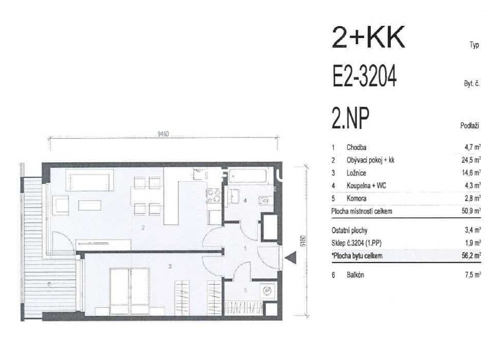 Byt se pronajímá nevybavený, nachází se v druhém nadzemním podlaží a skládá se z obývacího pokoje s kuchyňským koutem, balkonu, ložnice, chodby, koupelny a komory. V bytě bude nová kuchyňská linka vybavená elektrickým sporákem, troubou, digestoří a myčkou. V koupelně se nachází vana, umyvadlo, toaleta a přípojka na pračku.