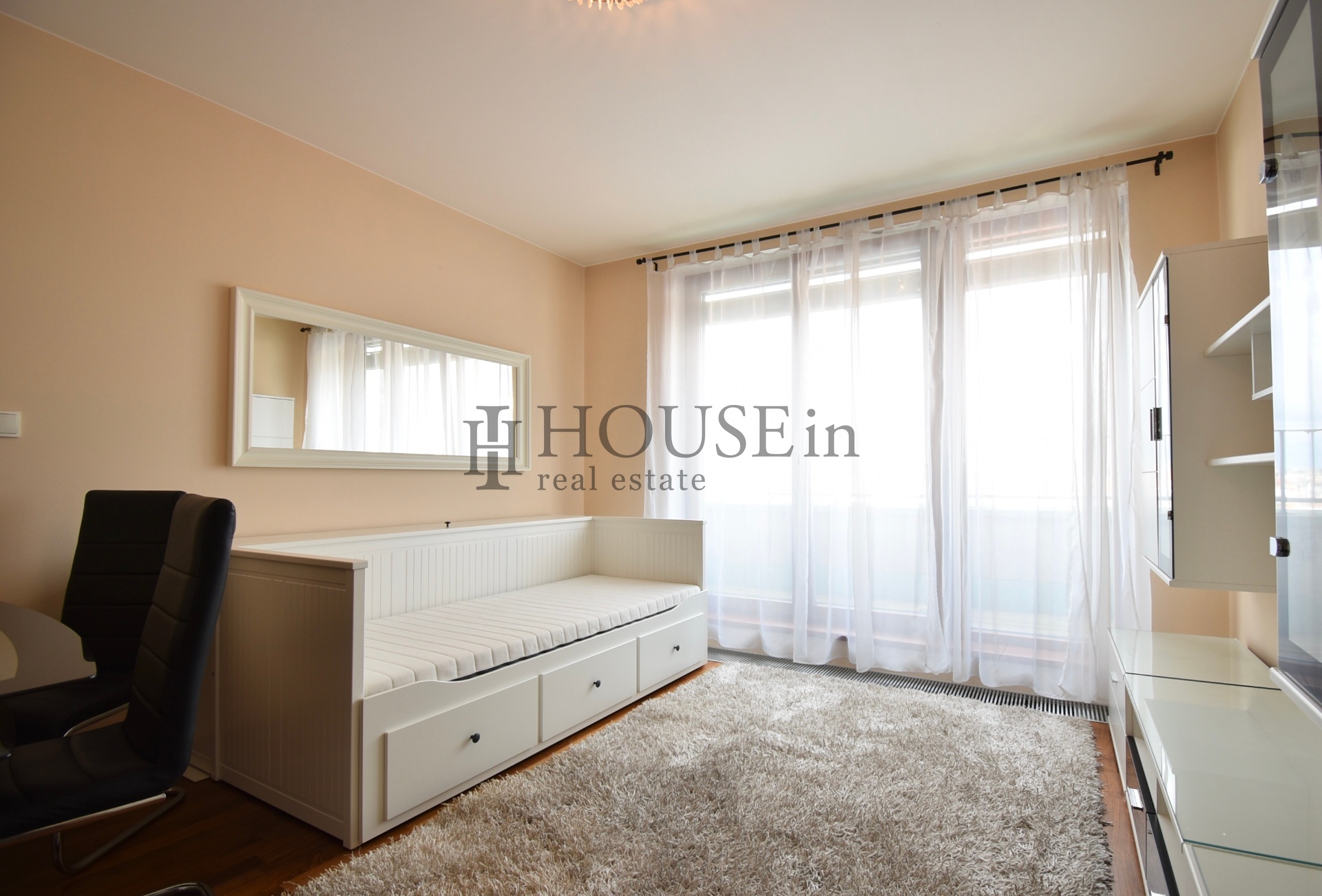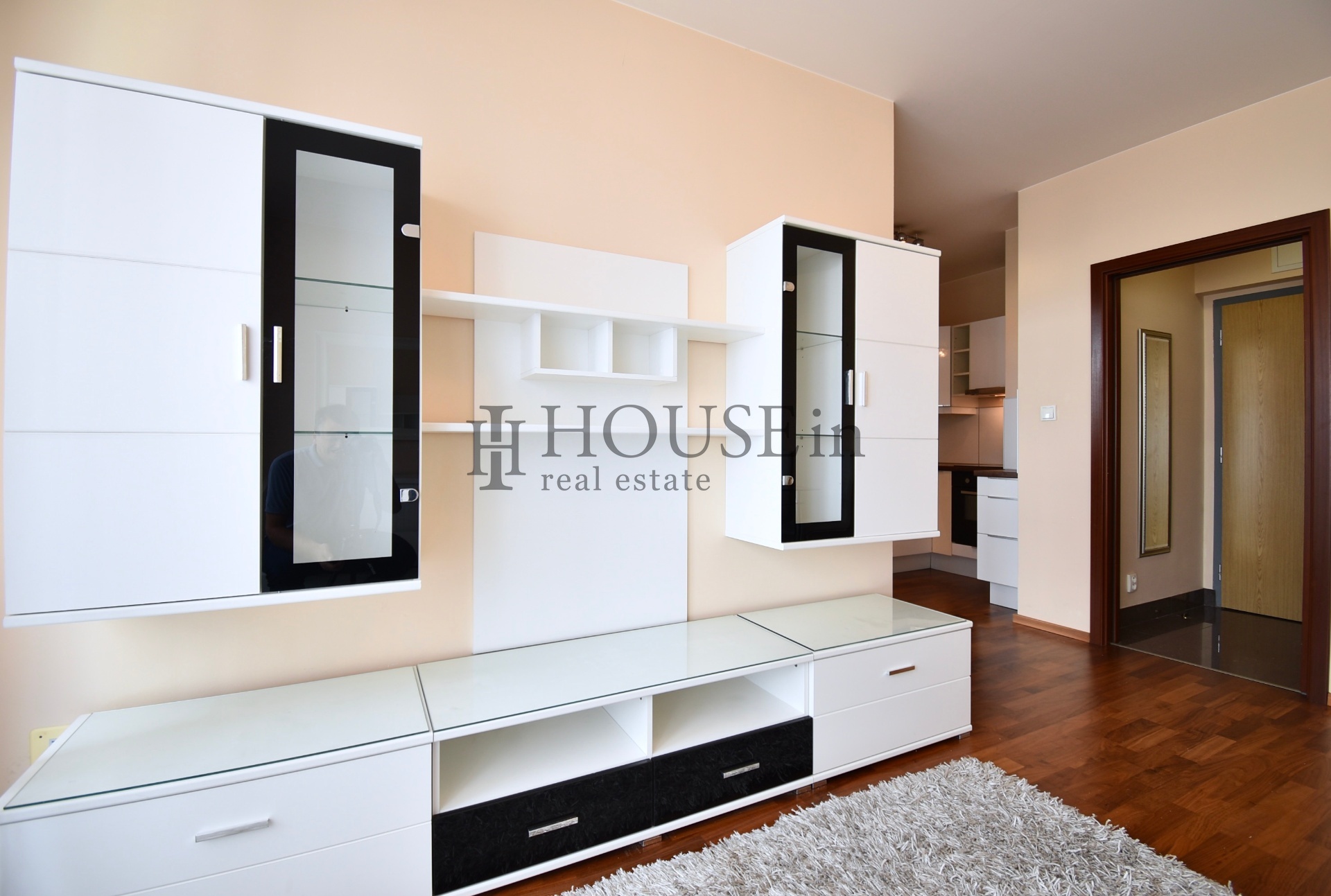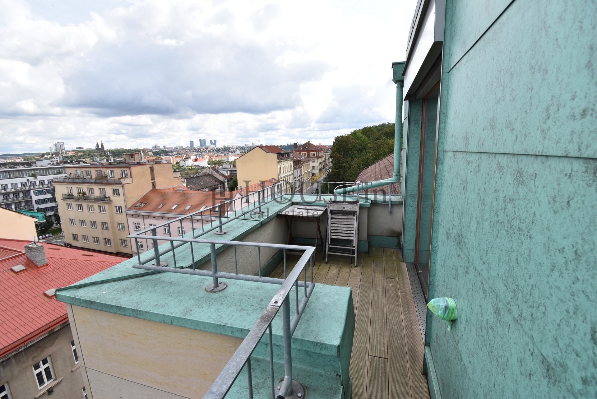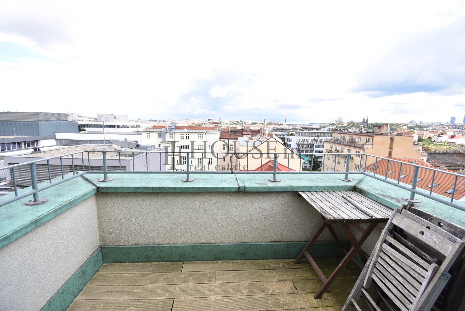 Byt nabízí prakticky řešenou vstupní předsíň s úložným prostorem a pračkou, komoru, prostorný obývací pokoj se sedací soupravou, jídelním stolem se židlemi a obývací stěnou. Kuchyňský kout je oddělený a plně vybavený spotřebiči, mezi které patří myčka, sklokeramická varná deska, elektrická trouba, digestoř a lednice s mrazákem. Ložnice je zařízena velkou šatní skříní a dvoulůžkovou postelí bez matrace. Z obývací části je přímý vstup na slunnou terasu s krásným výhledem na Vyšehrad a panorama Prahy.
