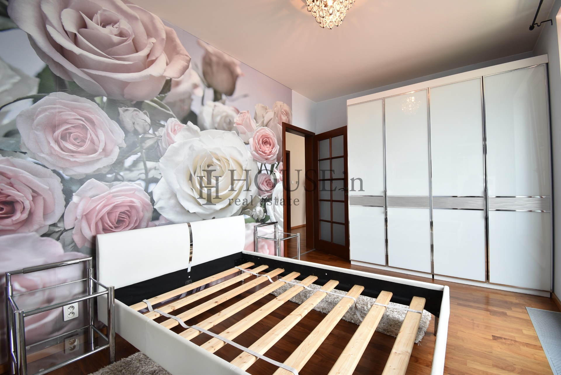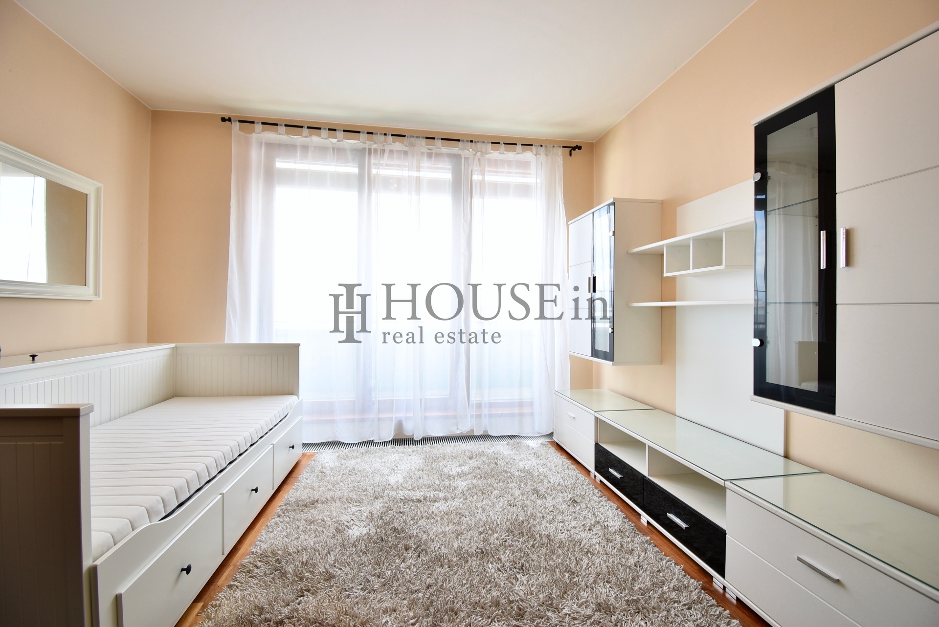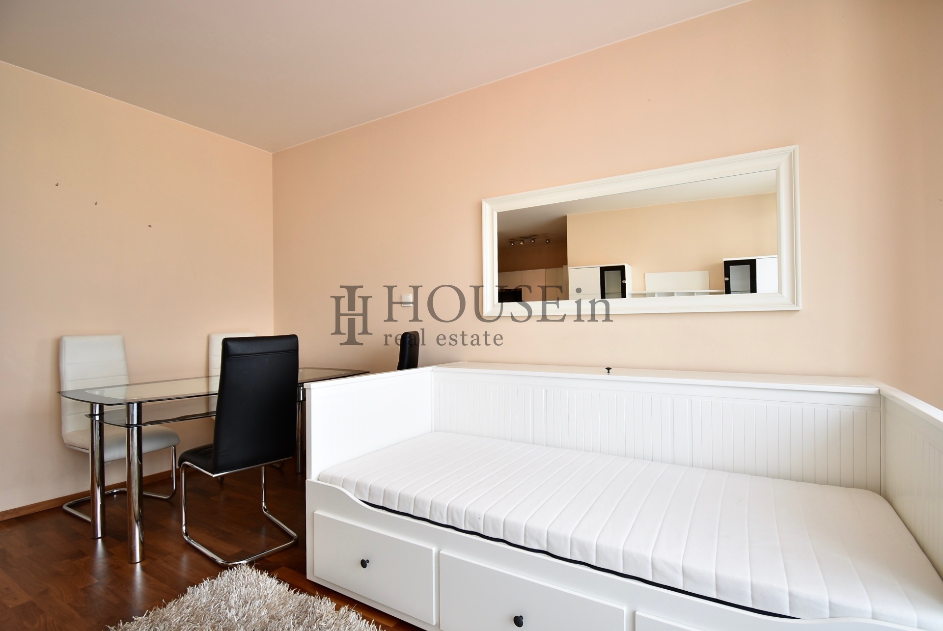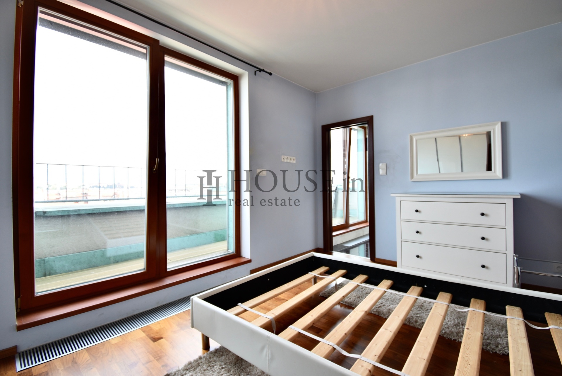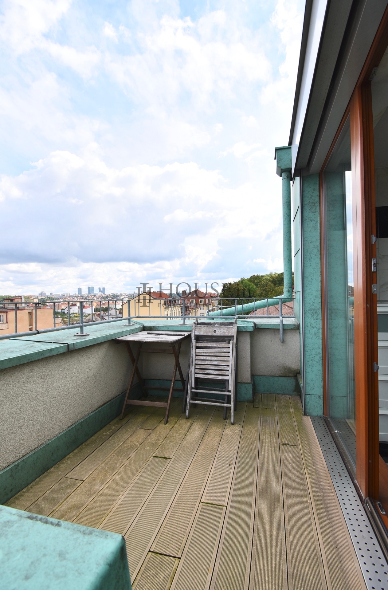 Byt nabízí prakticky řešenou vstupní předsíň s úložným prostorem a pračkou, komoru, prostorný obývací pokoj se sedací soupravou, jídelním stolem se židlemi a obývací stěnou. Kuchyňský kout je oddělený a plně vybavený spotřebiči, mezi které patří myčka, sklokeramická varná deska, elektrická trouba, digestoř a lednice s mrazákem. Ložnice je zařízena velkou šatní skříní a dvoulůžkovou postelí bez matrace. Z obývací části je přímý vstup na slunnou terasu s krásným výhledem na Vyšehrad a panorama Prahy.