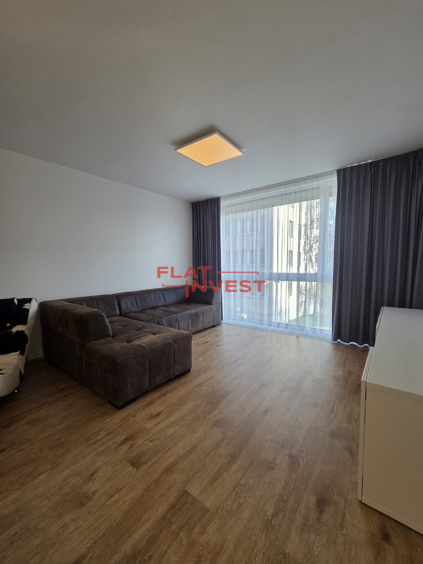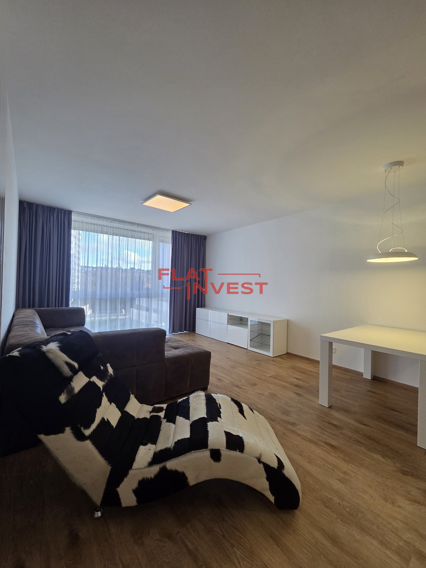 Interiér: Kvalitní nová vinylová podlaha v celém bytě, velkoformátová okna osazená záclonami a blackout závěsy pro dokonalé soukromí a stínění.
