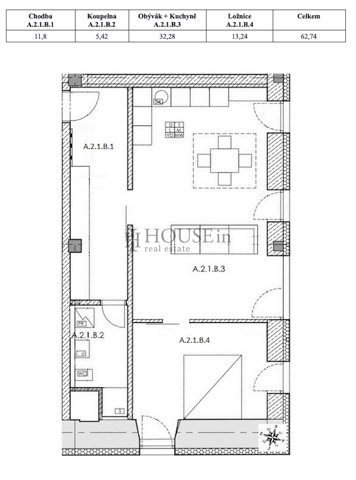 Byt se skládá z předsíně o výměře 11,8 m², obývacího pokoje s kuchyňským koutem o velikosti 32,28 m², ložnice o výměře 13,24 m² a koupelny s toaletou o velikosti 5,42 m². K bytu náleží také sklep umístěný v 1. podzemním podlaží domu.