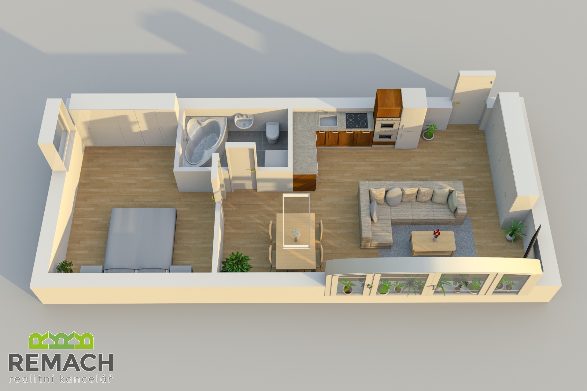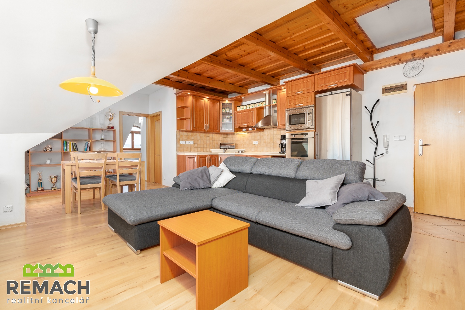 Obývací pokoj je propojen s kuchyní a jídelním koutem. V koupelně máte vanu, toaletu a přípojku na pračku, ta také zůstává.