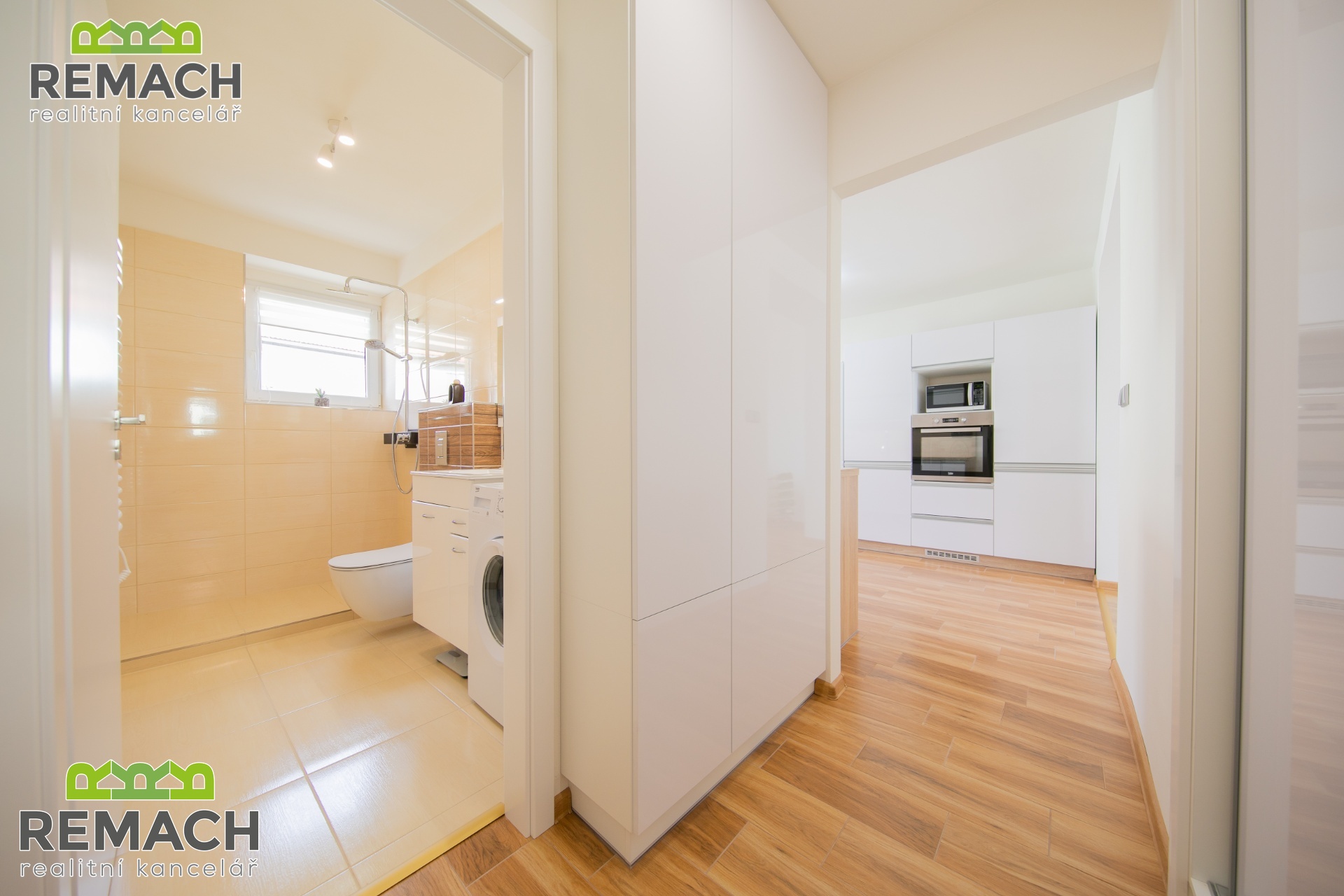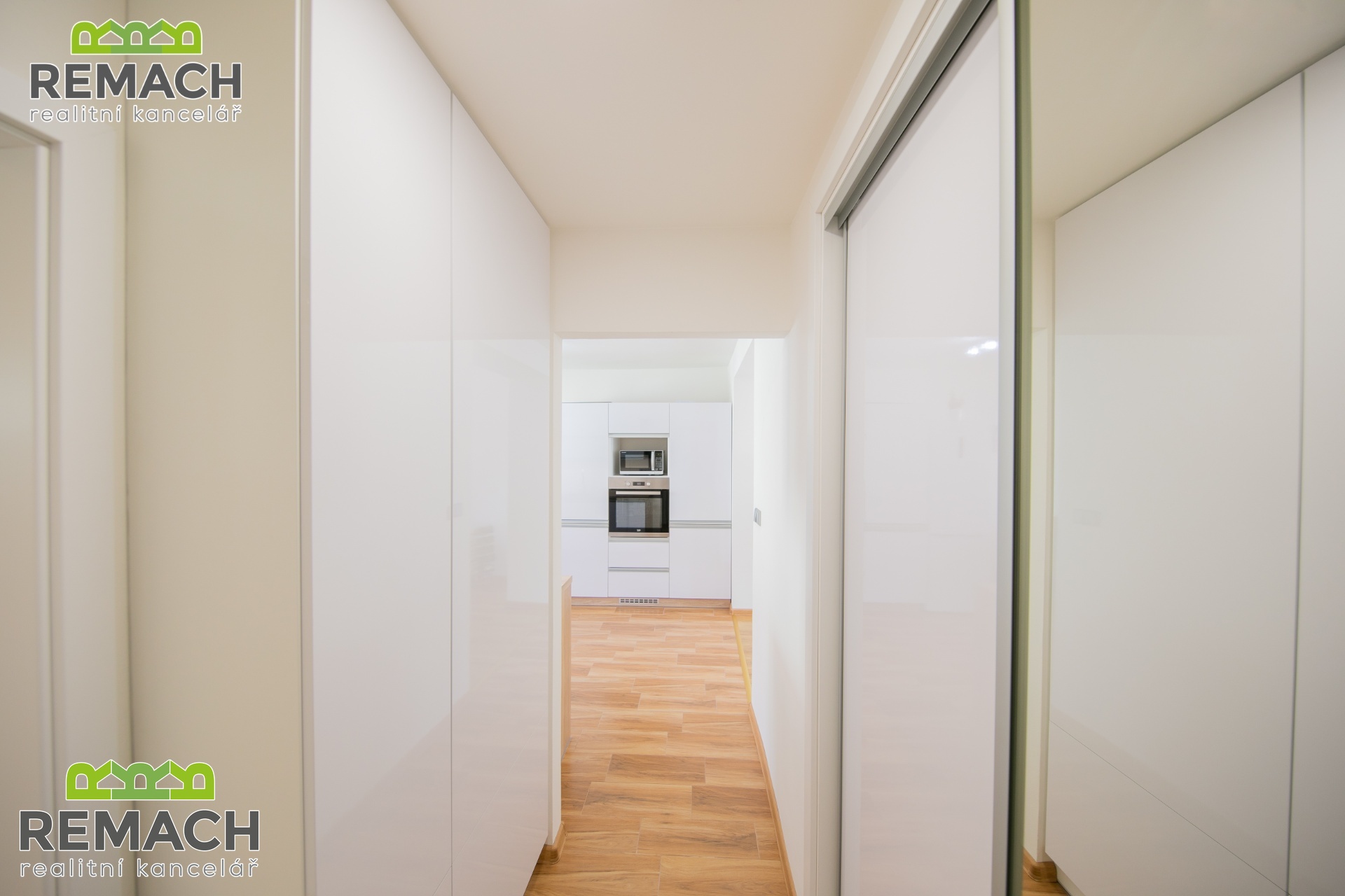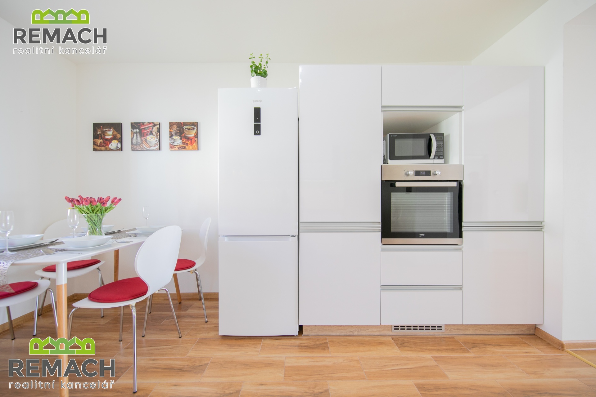 Součástí nájmu je i kompletní vybavení bytu. V předsíni jsou vestavné skříně, prostorná kuchyňská linka s vestavěnými spotřebiči včetně myčky, elektrická indukční sklokeramická deska, vestavná trouba, spižírna, dostatek úložných prostor.