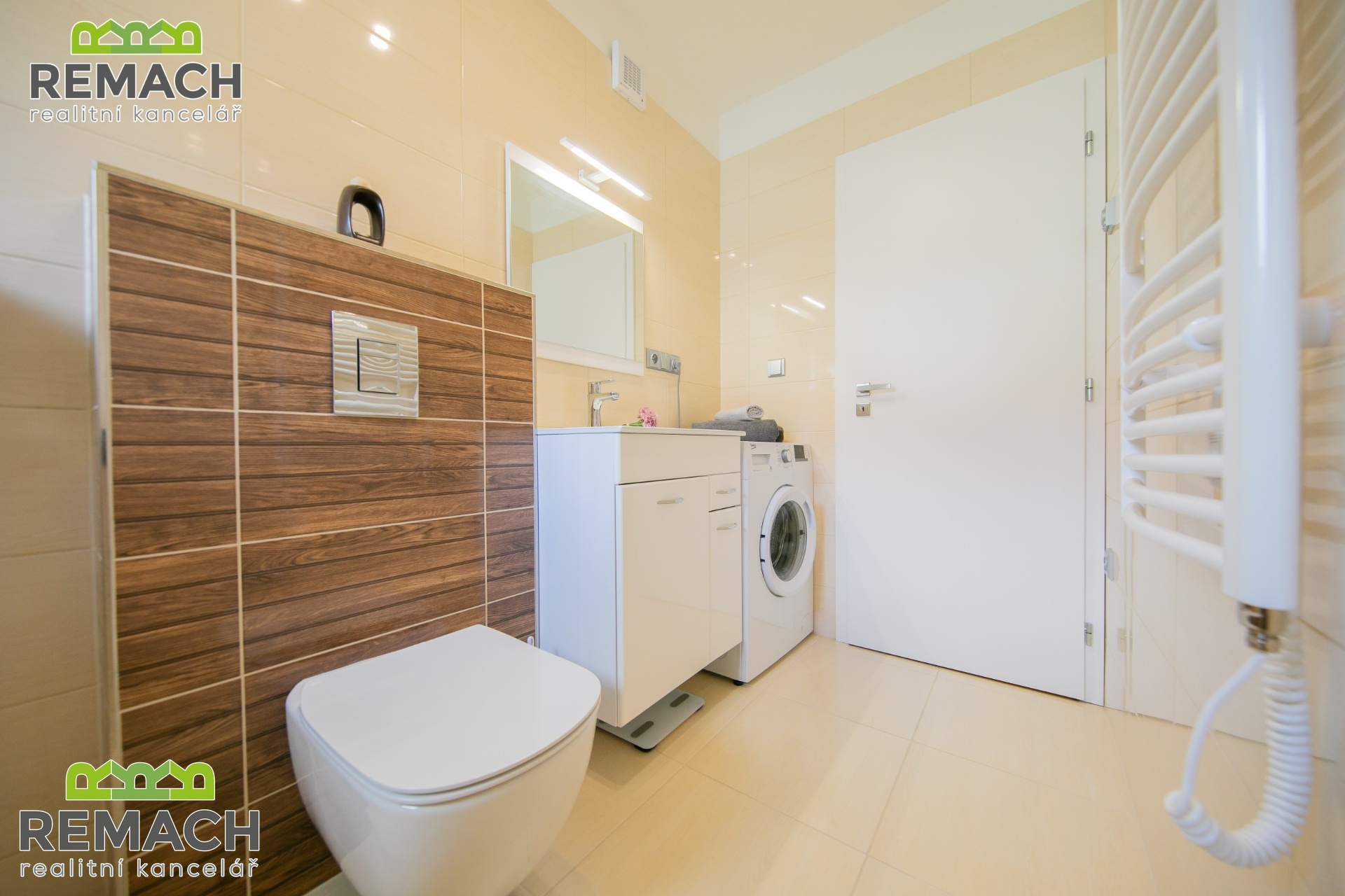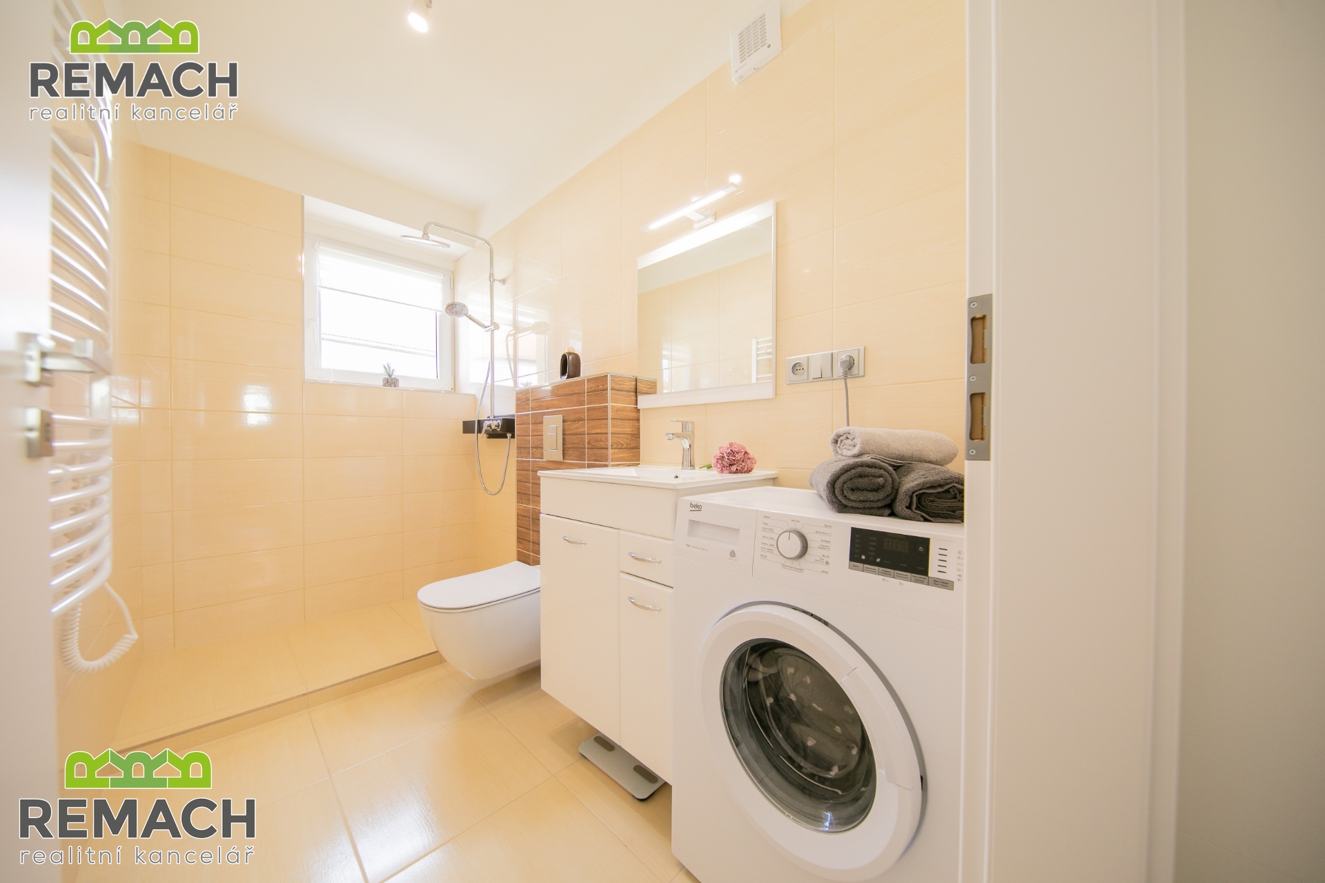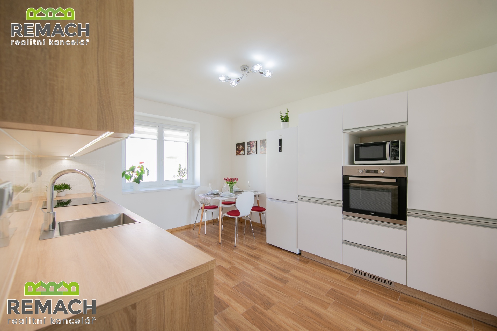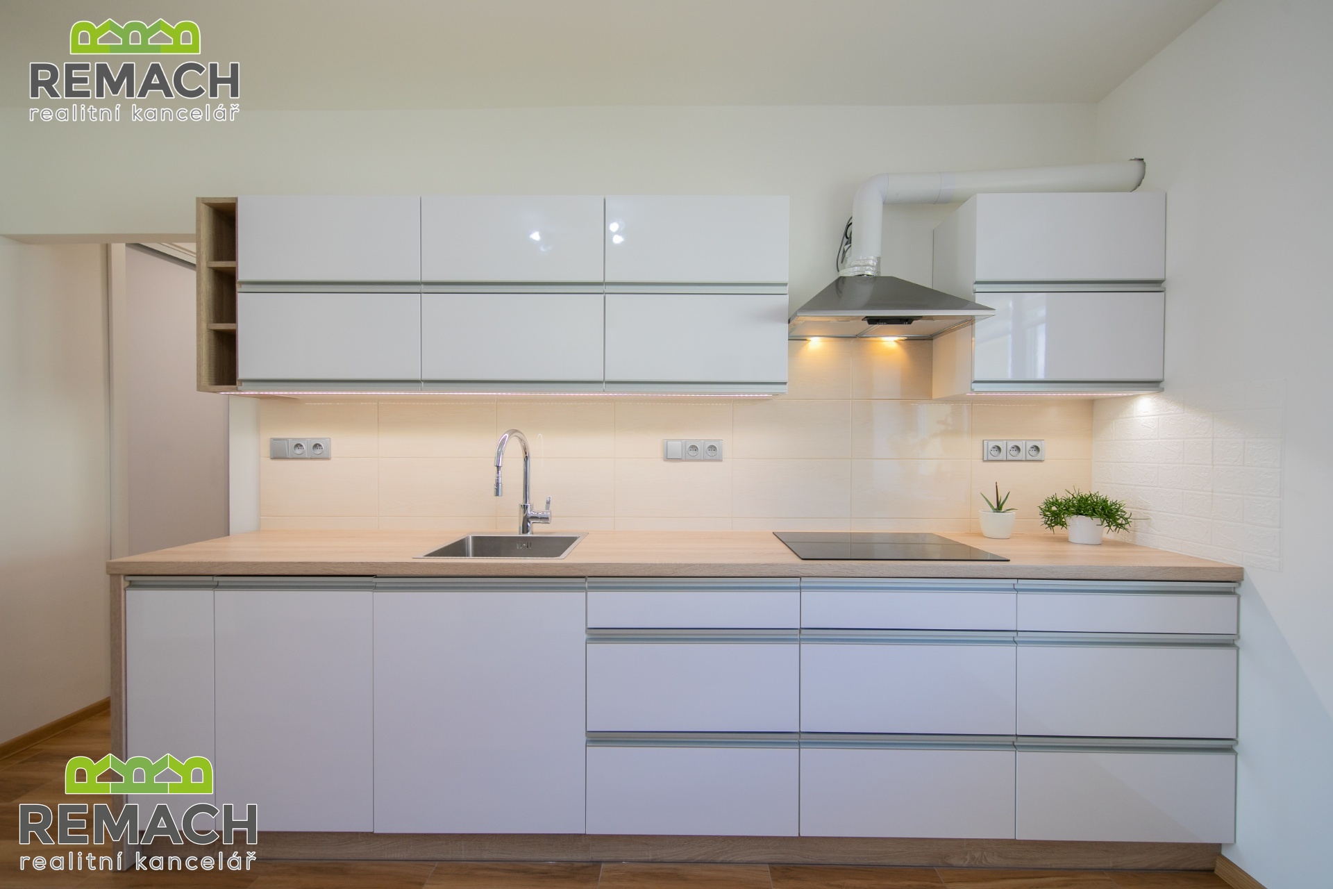 Součástí nájmu je i kompletní vybavení bytu. V předsíni jsou vestavné skříně, prostorná kuchyňská linka s vestavěnými spotřebiči včetně myčky, elektrická indukční sklokeramická deska, vestavná trouba, spižírna, dostatek úložných prostor.