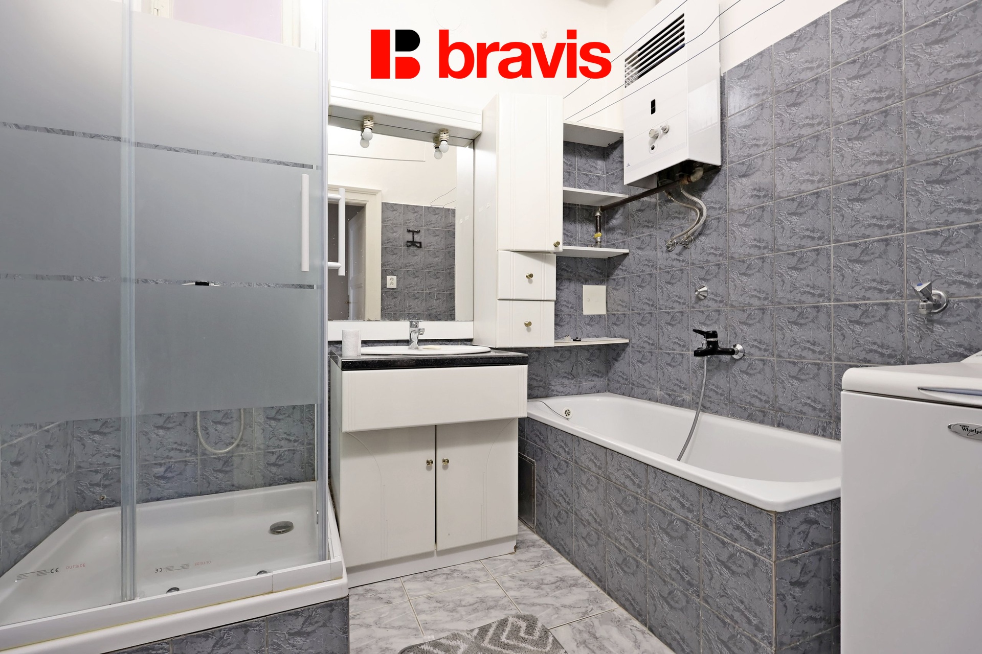 V koupelně je vana, sprchový kout a pračka, toaleta je oddělena.