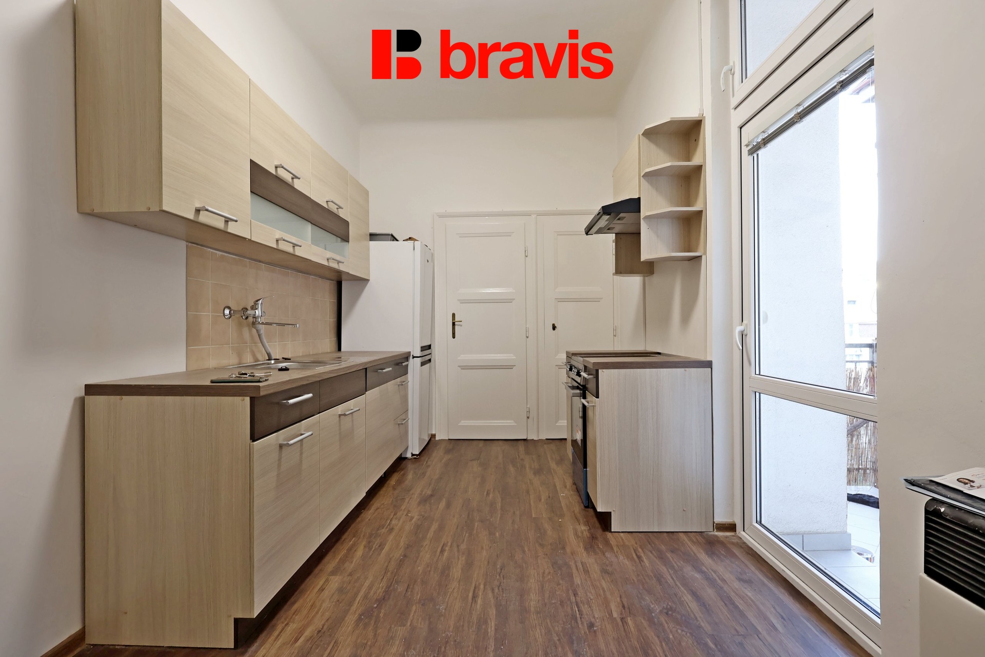 Kuchyně je vybavená novou myčkou, elektrickou troubou, varnou deskou a lednicí. Z kuchyně je vstup na balkon orientovaný do klidného vnitrobloku. Z kuchyně je přístup do bývalého pokoje pro služebnictvo, vhodného k uskladnění potravin. Dále je k dispozici samostatná spíž.