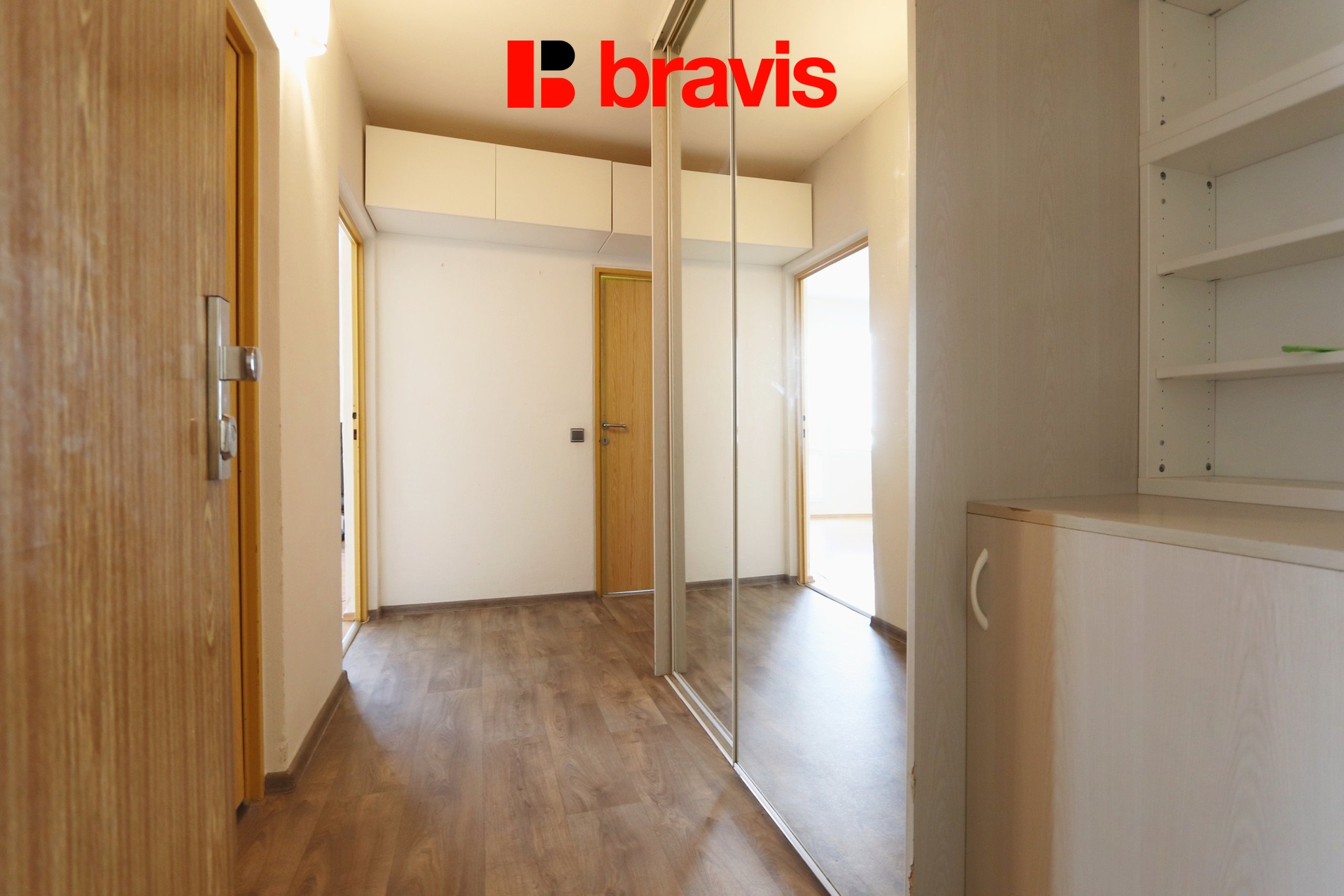 Kuchyně je vybavena kuchyňskou linkou s plynovou varnou deskou, troubou, digestoří, lednicí s mrazákem a jídelním stolem se židlemi. Prostorný obývací pokoj je nezařízený, což dává možnost si jej vybavit dle vlastních představ, a nabízí přímý vstup na balkón. V ložnici naleznete dvě velké šatní skříně, další pokoj je rovněž nezařízený. V předsíni je umístěna další praktická šatní skříň.