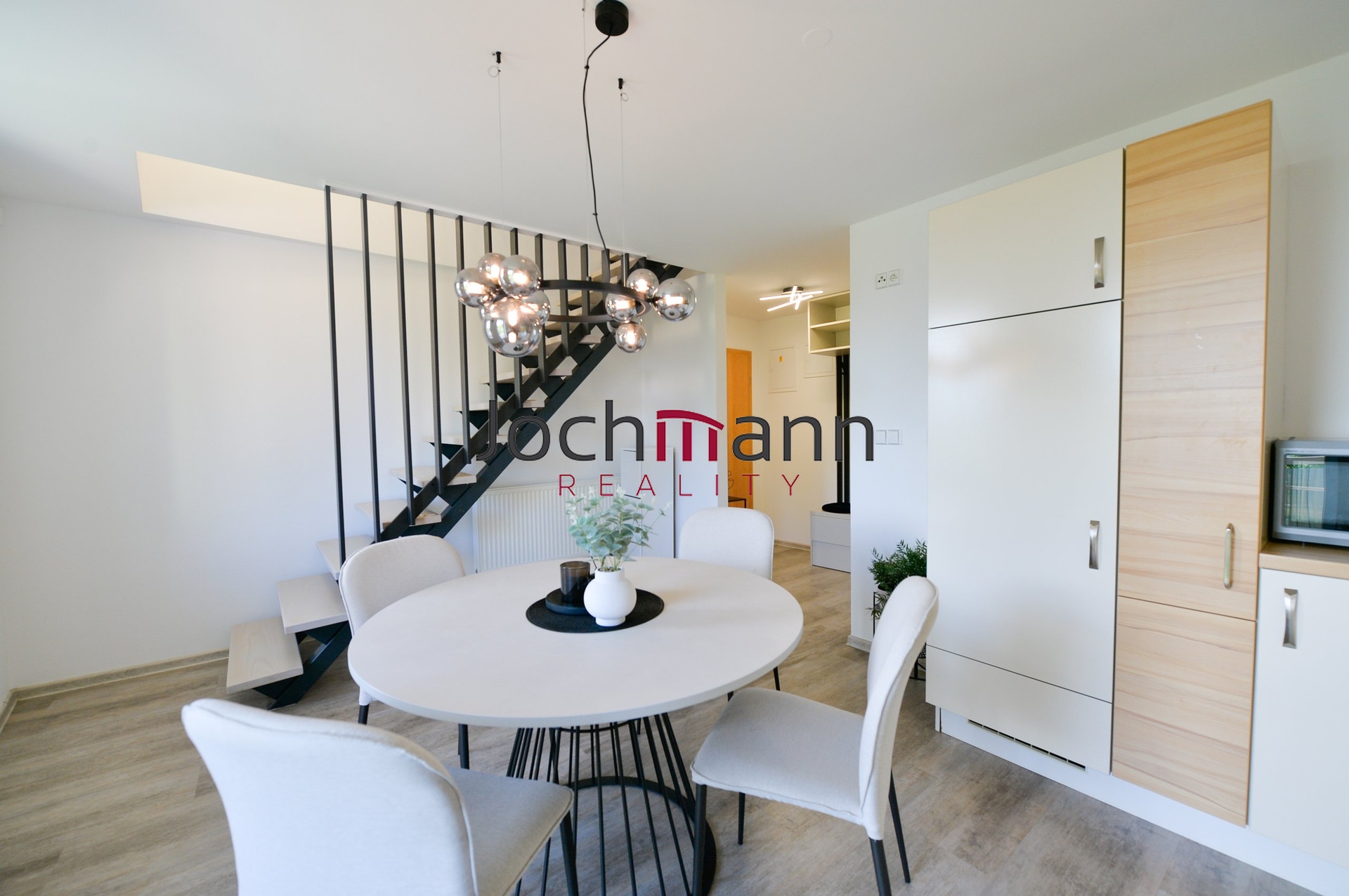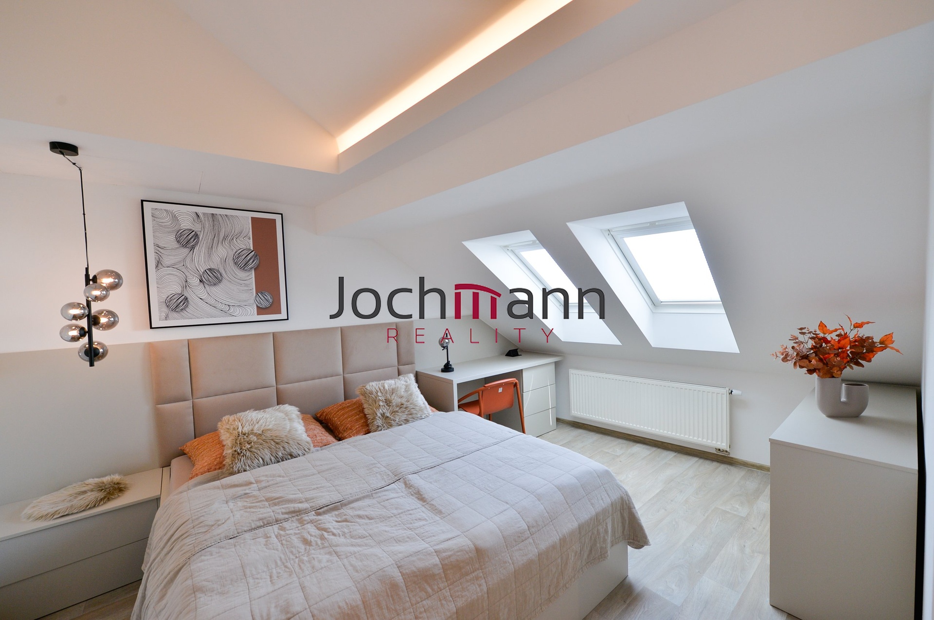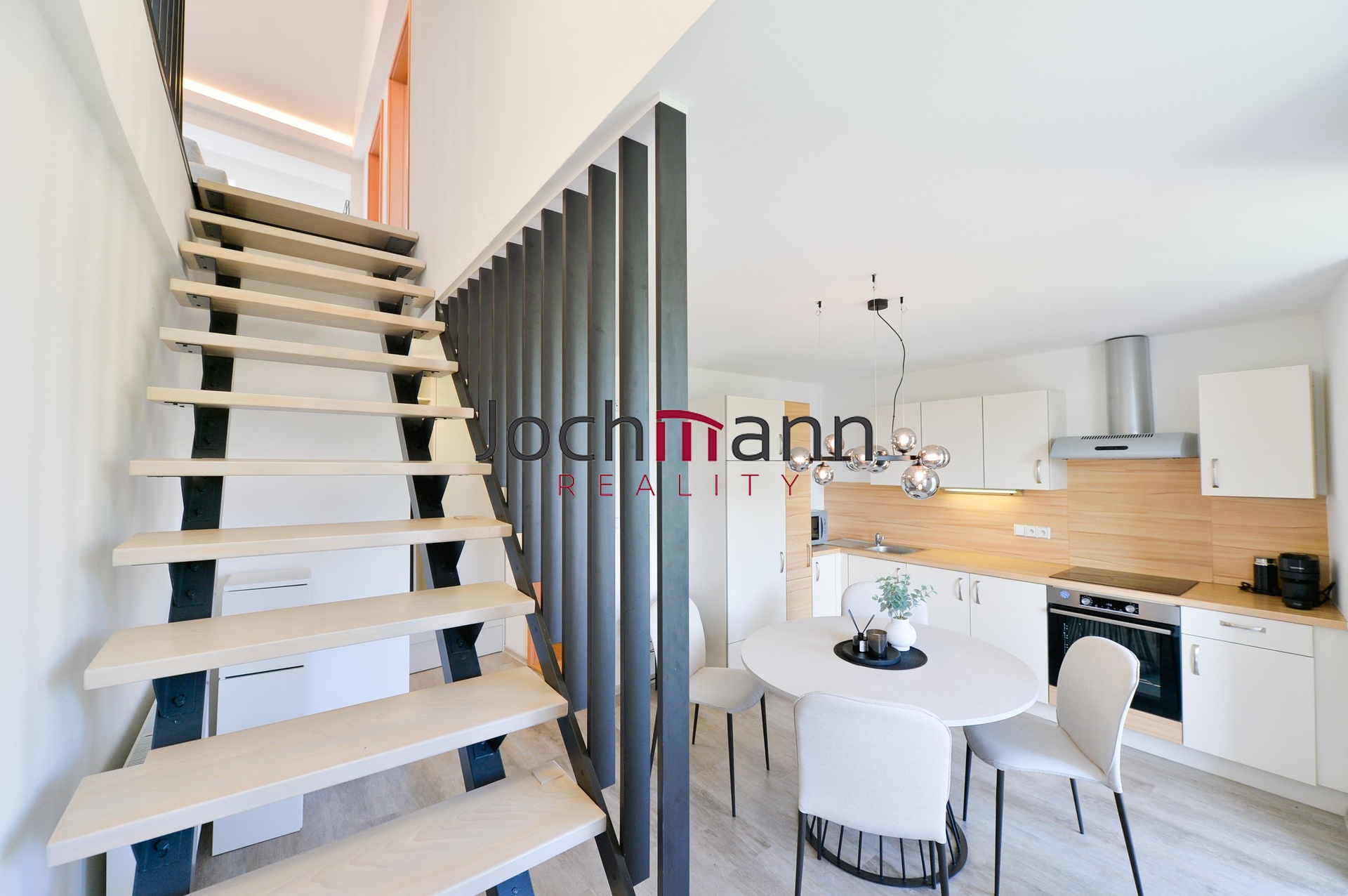 V patře bytu se nachází dva další samostatné kompletně vybavené pokoje (ložnice a druhý pokoj) a prostorná obývací místnost s designovými prvky. V neposlední řadě byt disponuje koupelnou se sprchovým koutem, toaletou a pračkou a sušičkou.